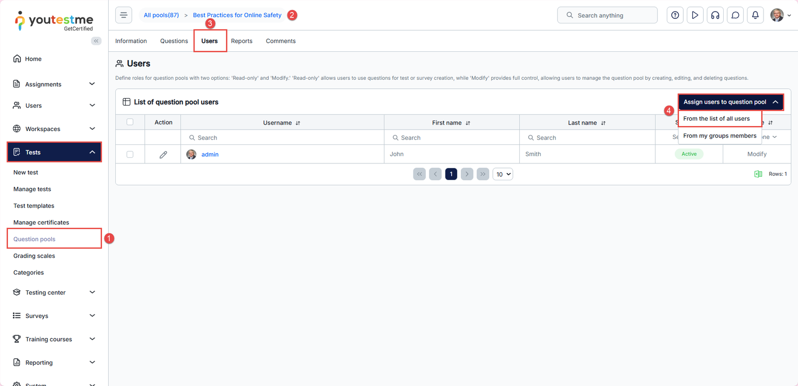 - Click Assign users to question pool, and select From the list of all users.