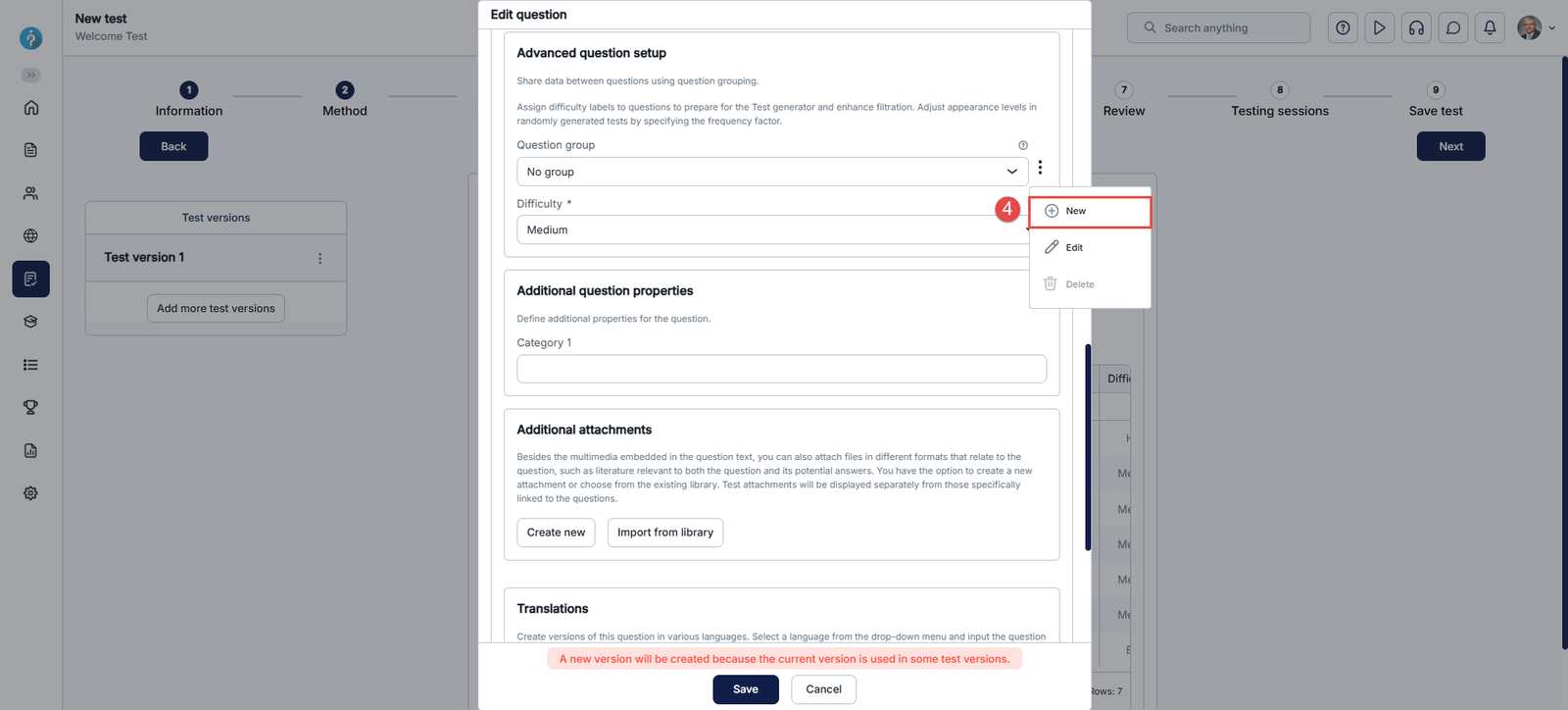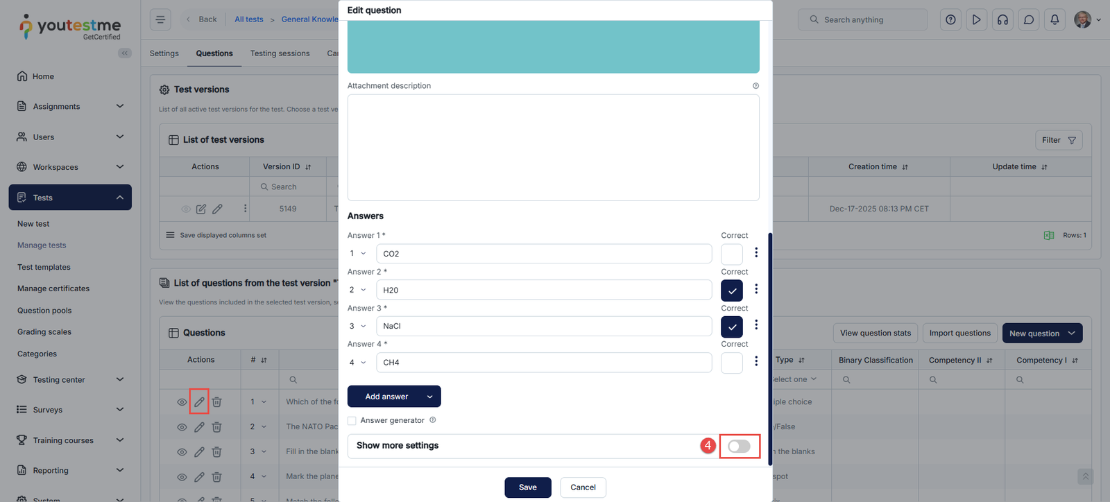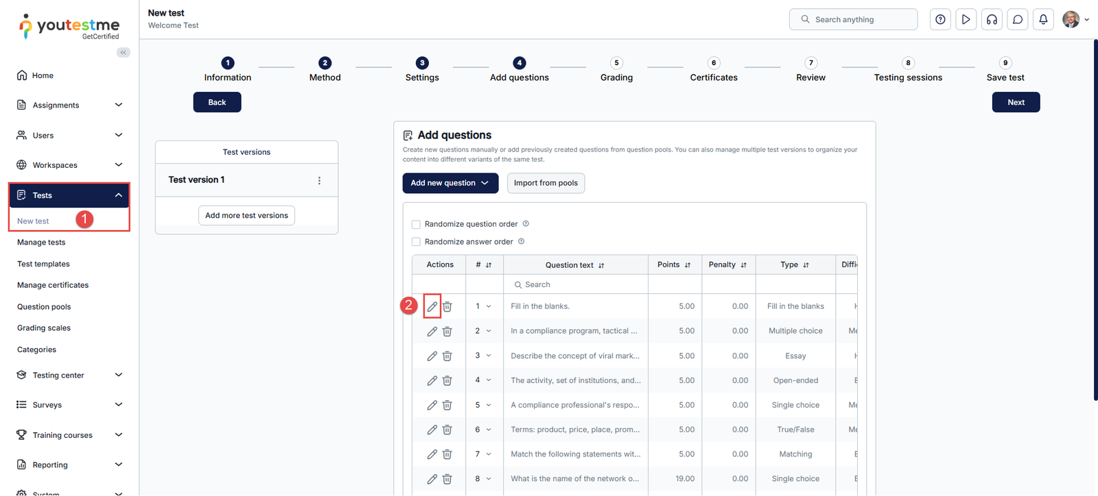 - Open the desired question in the fourth step of the test creation wizard by clicking the Edit icon.
