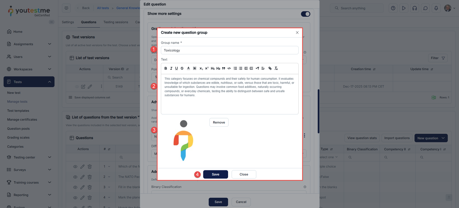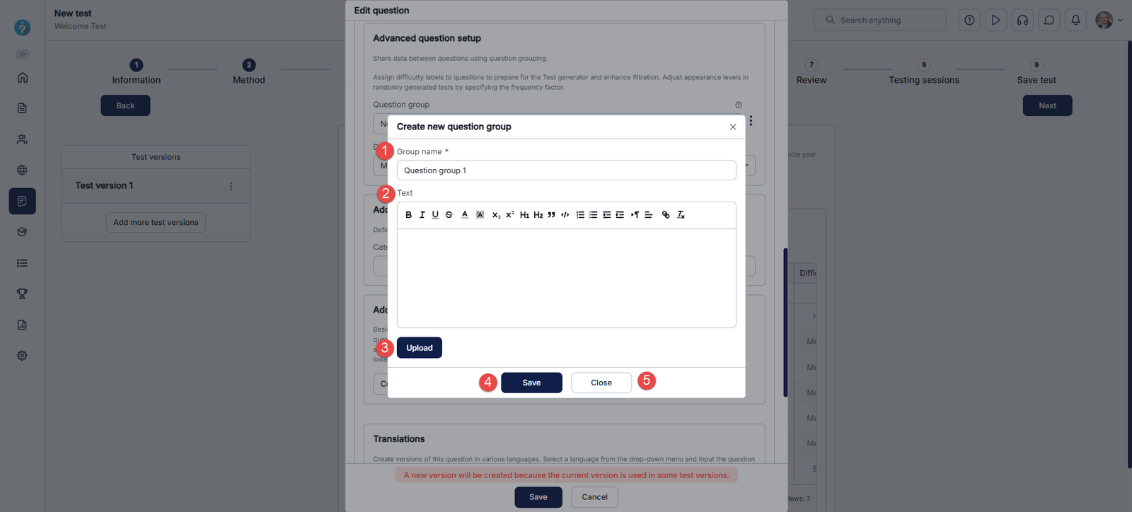 This article explains how to create and use question groups within a test. It guides you through the steps to organize questions under a shared group, add a group title, and include optional text or multimedia that will be displayed above each question in the group.