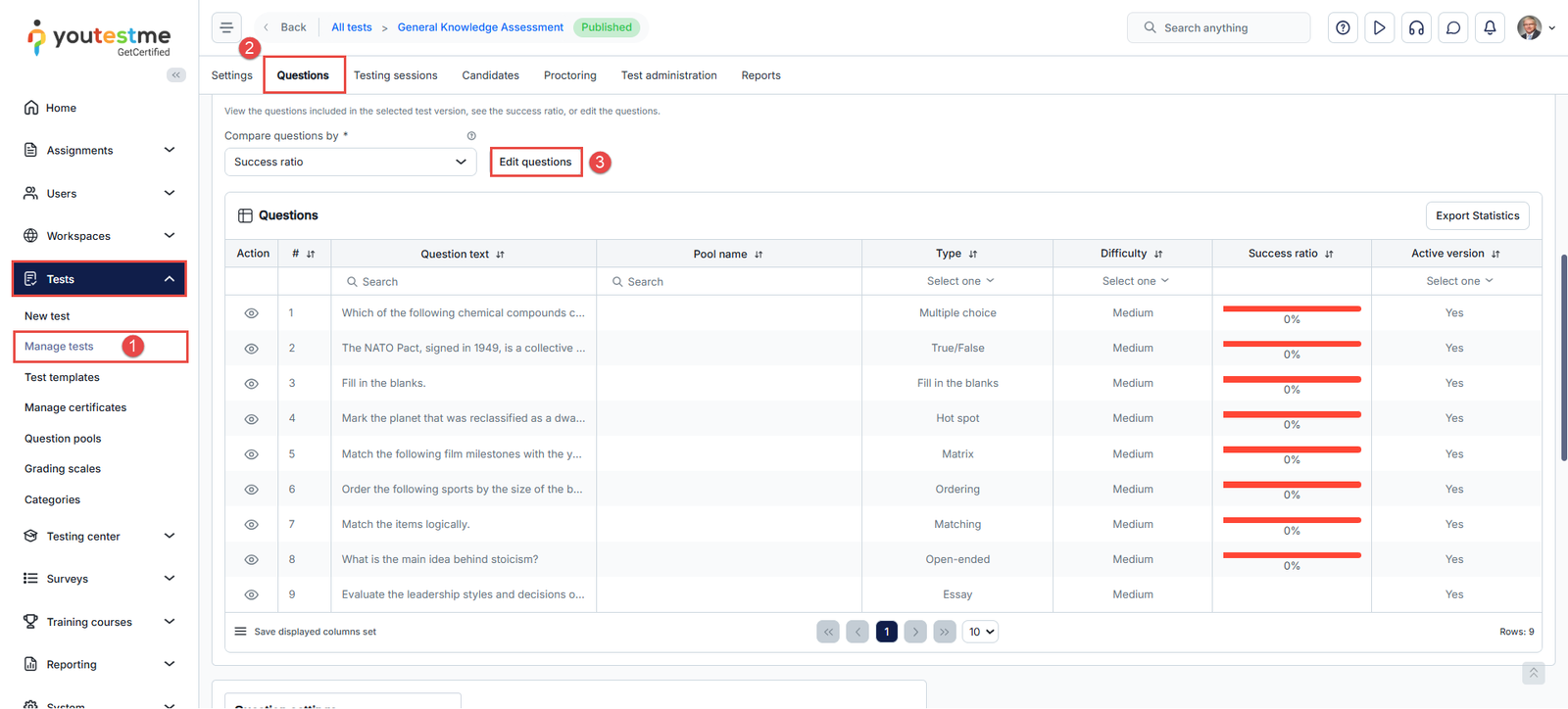 After manually creating a test, you can organize its questions by assigning each one to a relevant question group via the Questions tab.