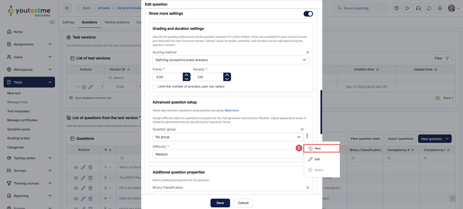 - Scroll down to the Question group option, click the vertical three-dots icon, and then click New.
