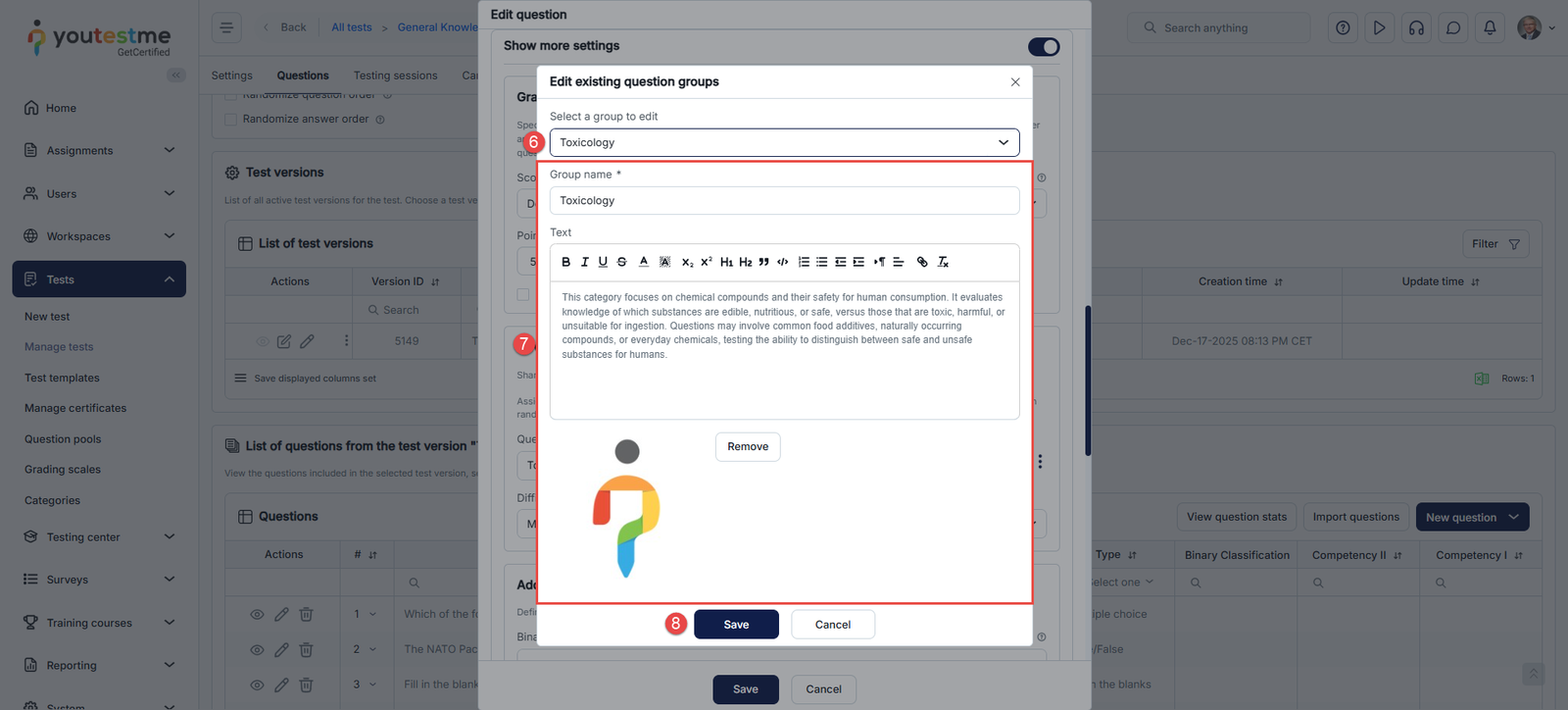 Once you add the questions you want in the test via the Add questions tab, you can assign an appropriate group to each of them.