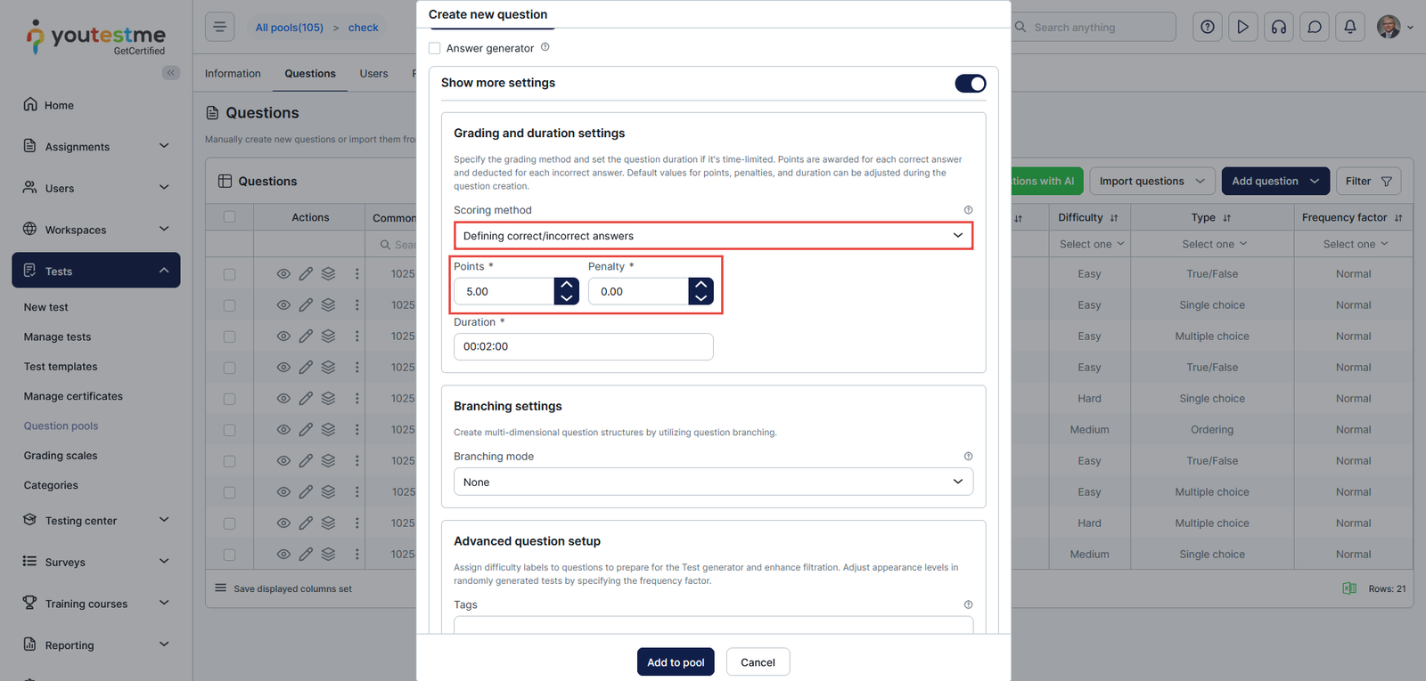 To create a demographic section, first, you need to create questions that carry 0 points. You can do this by selecting the Scoring method: “By answer weight” or “Defining correct/incorrect answers“, and setting the values to 0. This will allow you to collect data about the candidates without the answers affecting the final test result (for more information on creating each question type, please visit our support web page, and find an appropriate article).