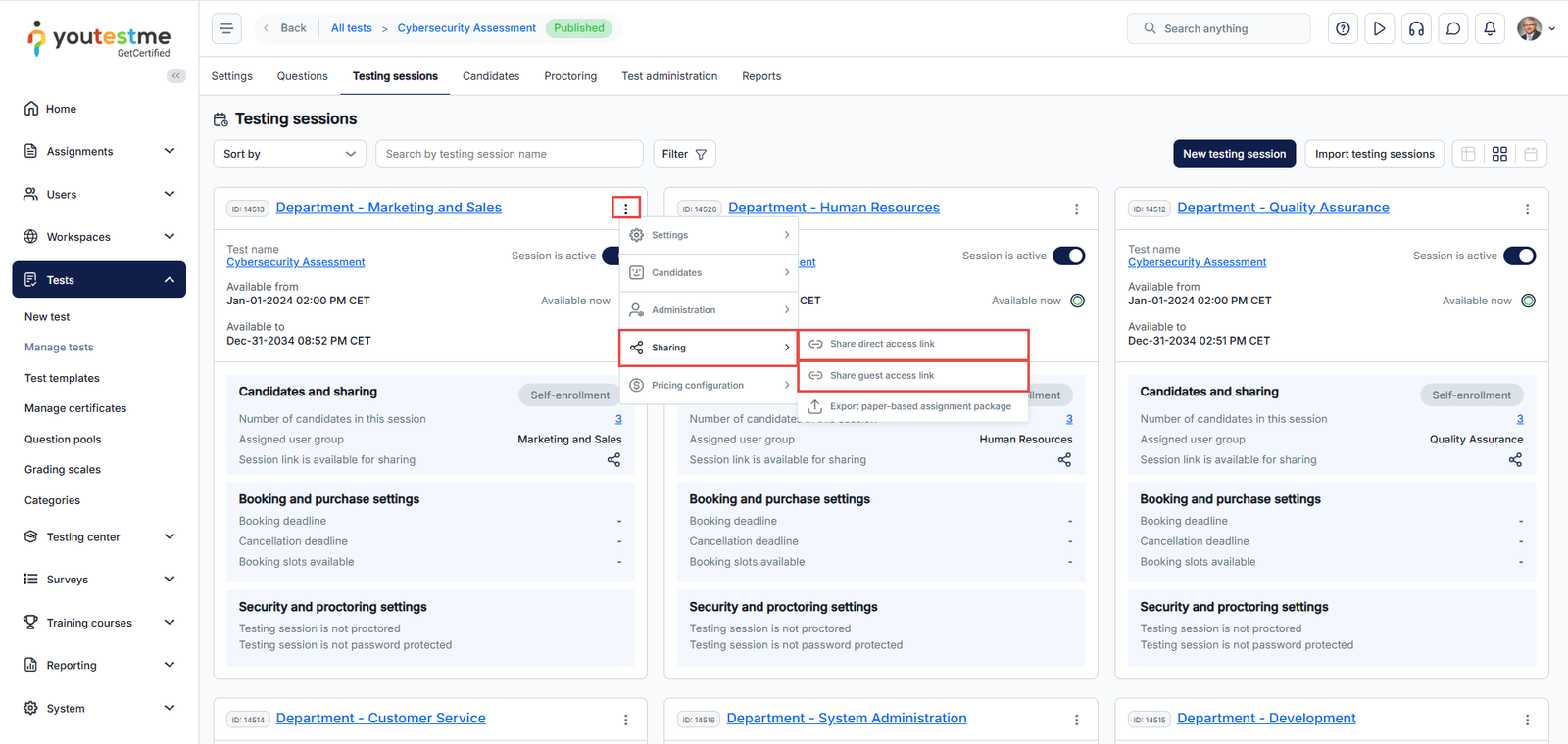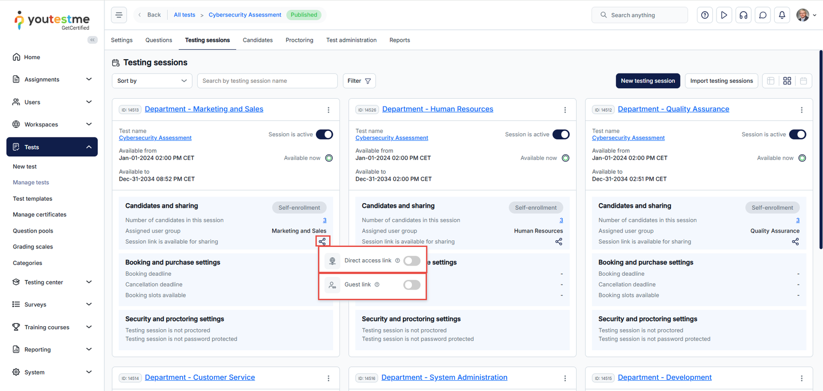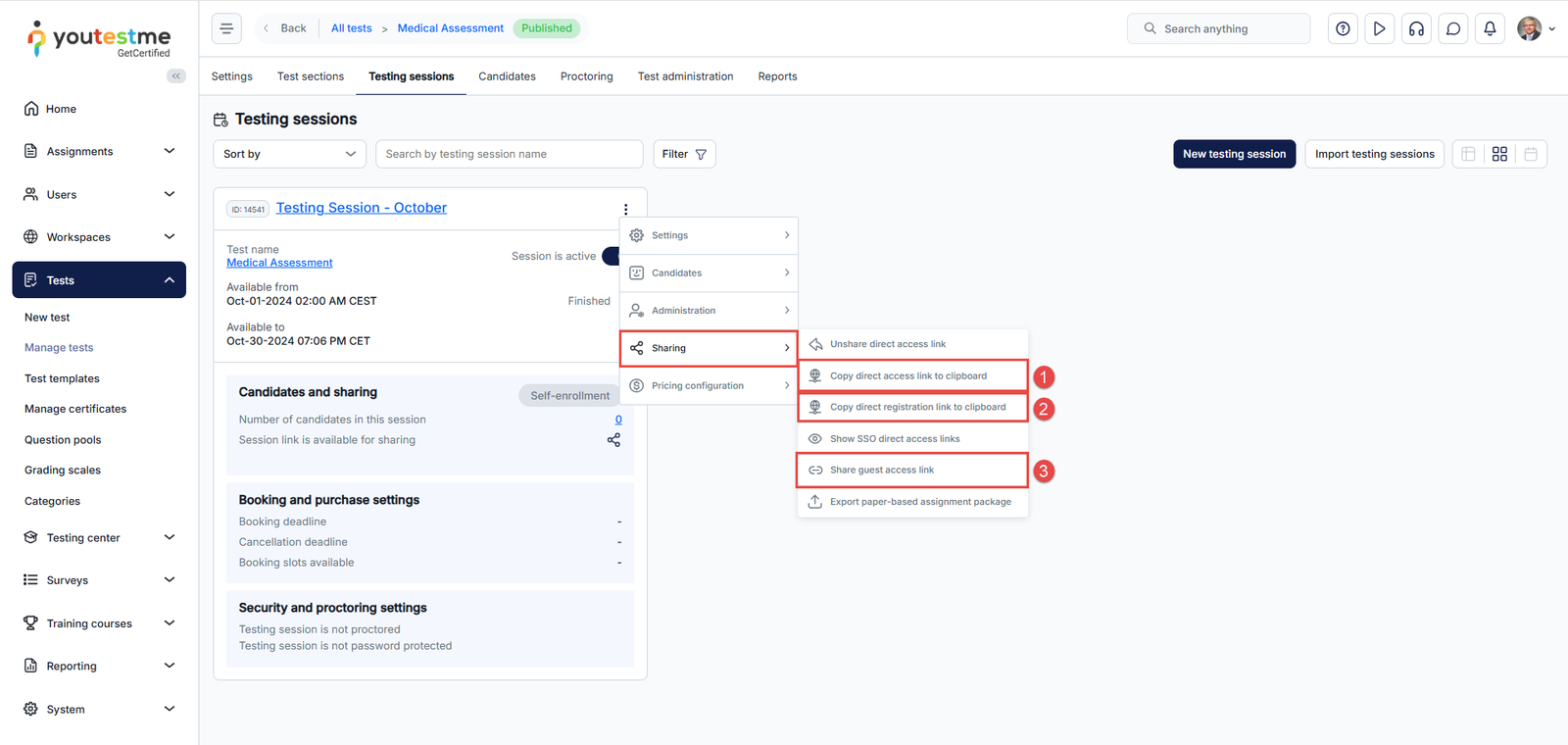 This article explains how to generate direct access, direct registration, and guest links for a testing session. These links provide candidates with quick, simplified access to tests without requiring them to navigate through the application manually. They are especially useful when communicating with large groups of test-takers, sending test invitations, or sharing access details via email or external communication channels. To learn how to create a testing session, please visit this link.