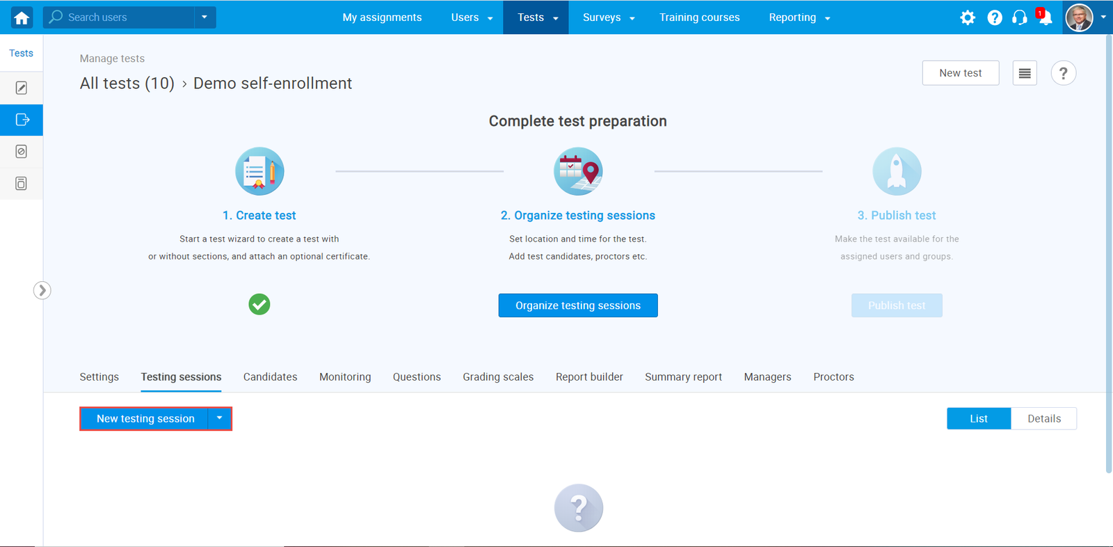 After you have created a test, organize a testing session by clicking on the “New testing session” button.