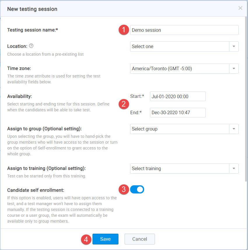 - Enable the “Candidate self-enrollment” option to create an open-access exam – all registered users, as well as those who subsequently register, will be able to start the test.