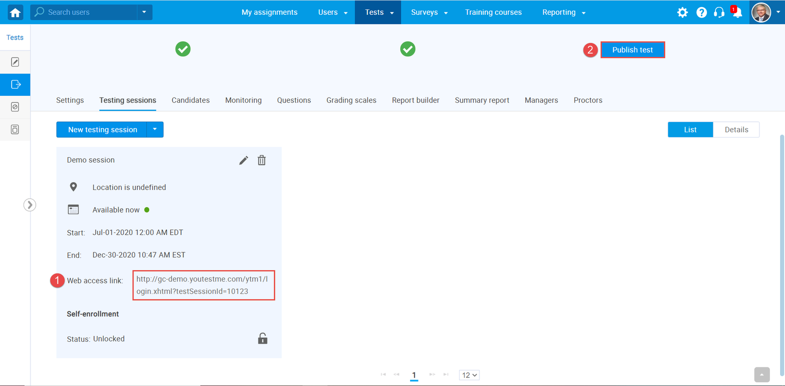 Testing sessions specify who and when can take the test. Before creating a testing session, you need to create a test.