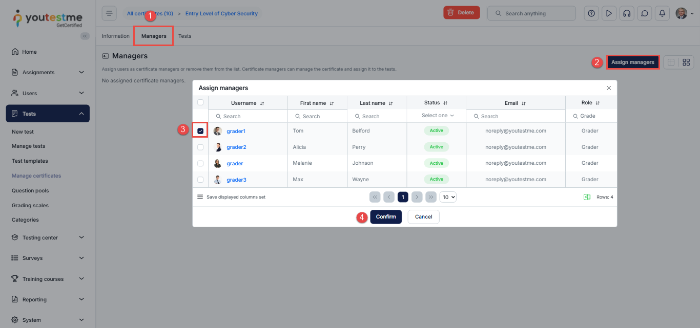 Note: Certificate managers have the ability to manage certificates and assign them to tests, regardless of their role within the system.