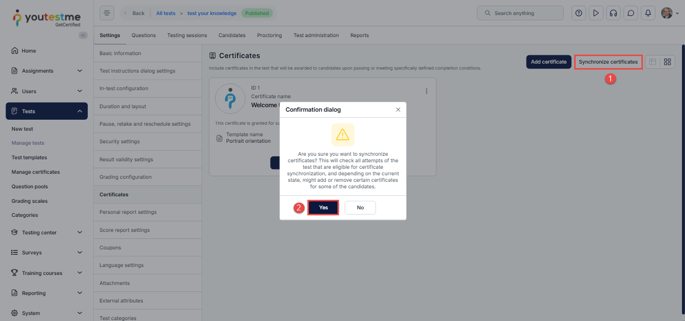 After modifying certificate conditions or test configurations, you may need to synchronize certificates to ensure that all changes are reflected in users’ assignments. This action re-evaluates the conditions for each candidate and assigns or removes certificates based on the most recent criteria.