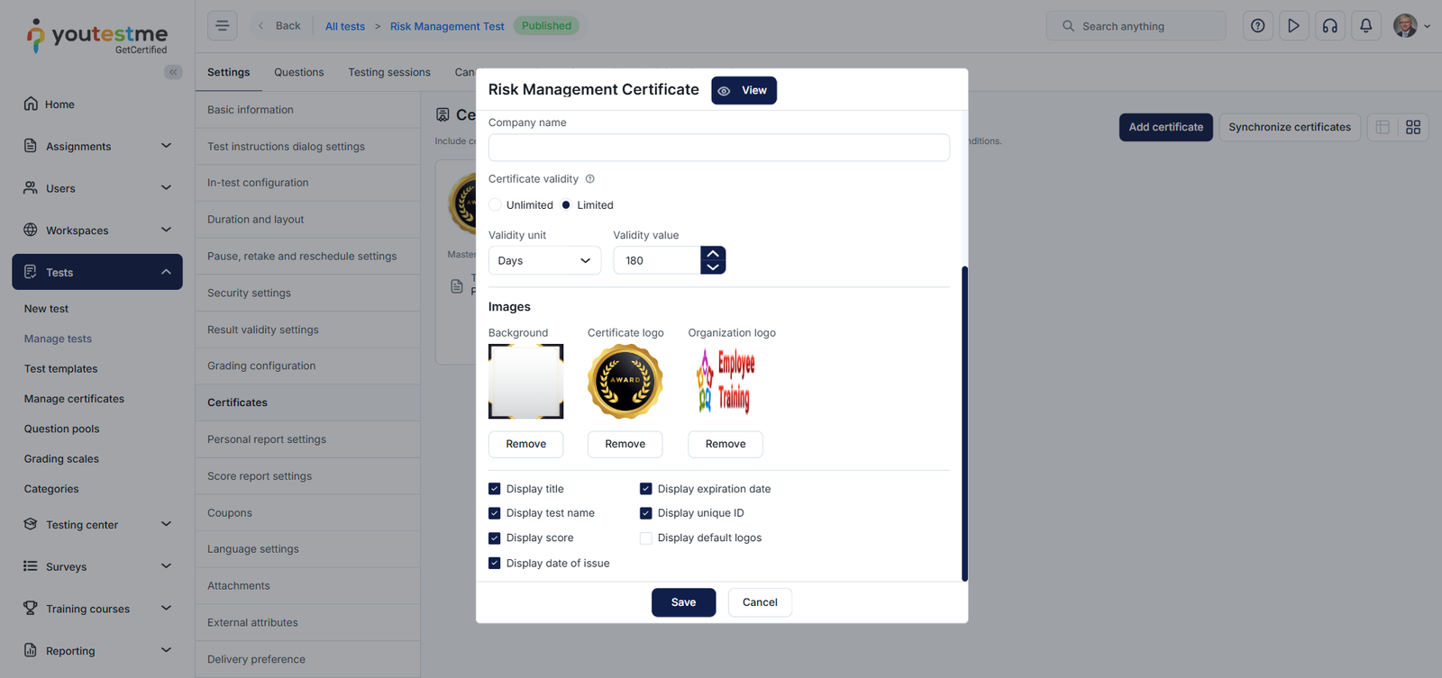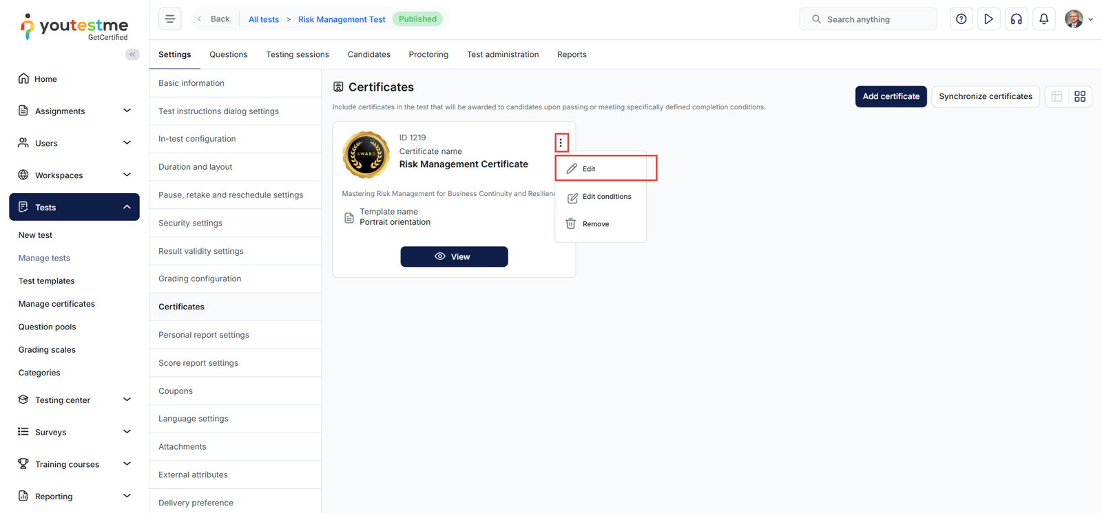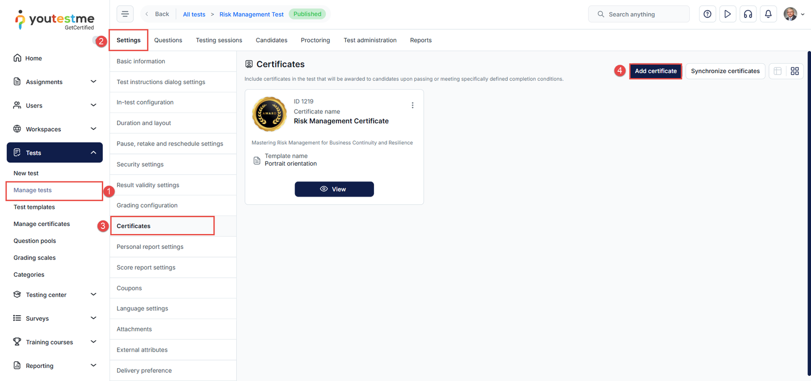 You can also add a certificate to the tests you’ve created from the test settings.
