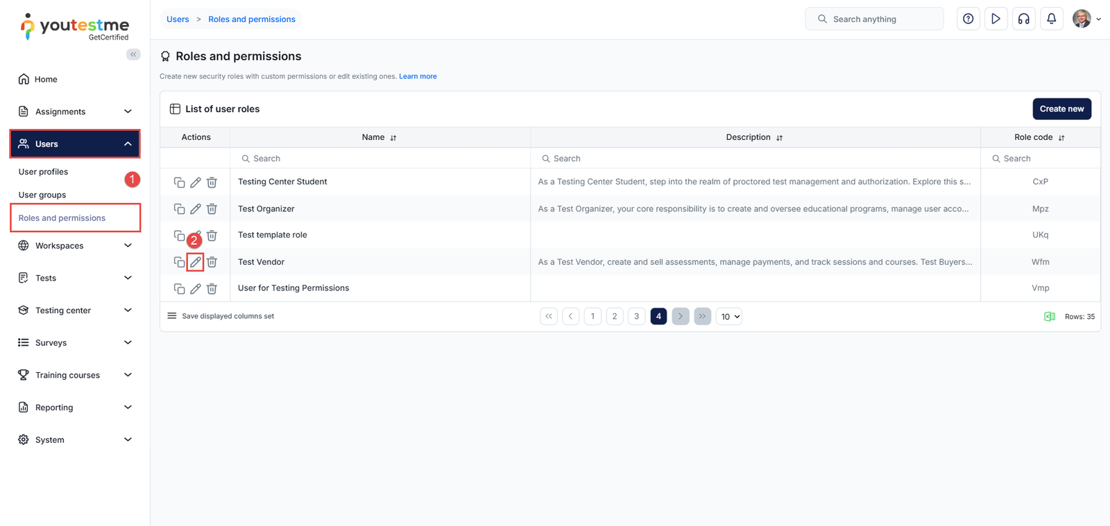 - Select the desired role and the Edit option in the Actions column.
