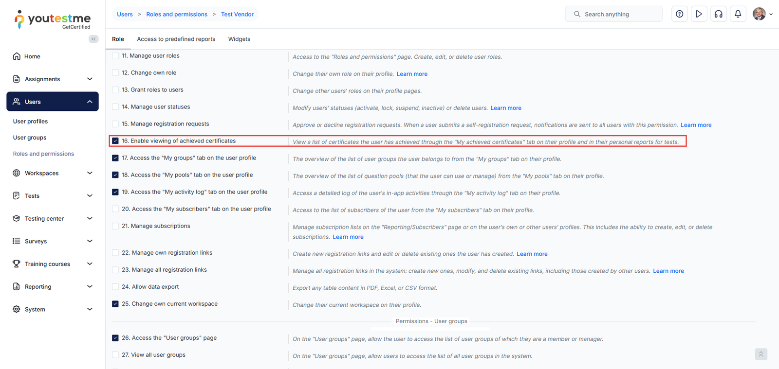 Scroll down for the Enable viewing of achieved certificates permission in the permissions list and check the box beside it.