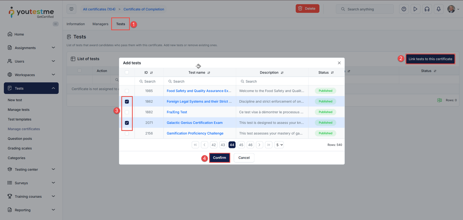 - Click the Link tests to this certificate button to assign the certificate to one or more tests.