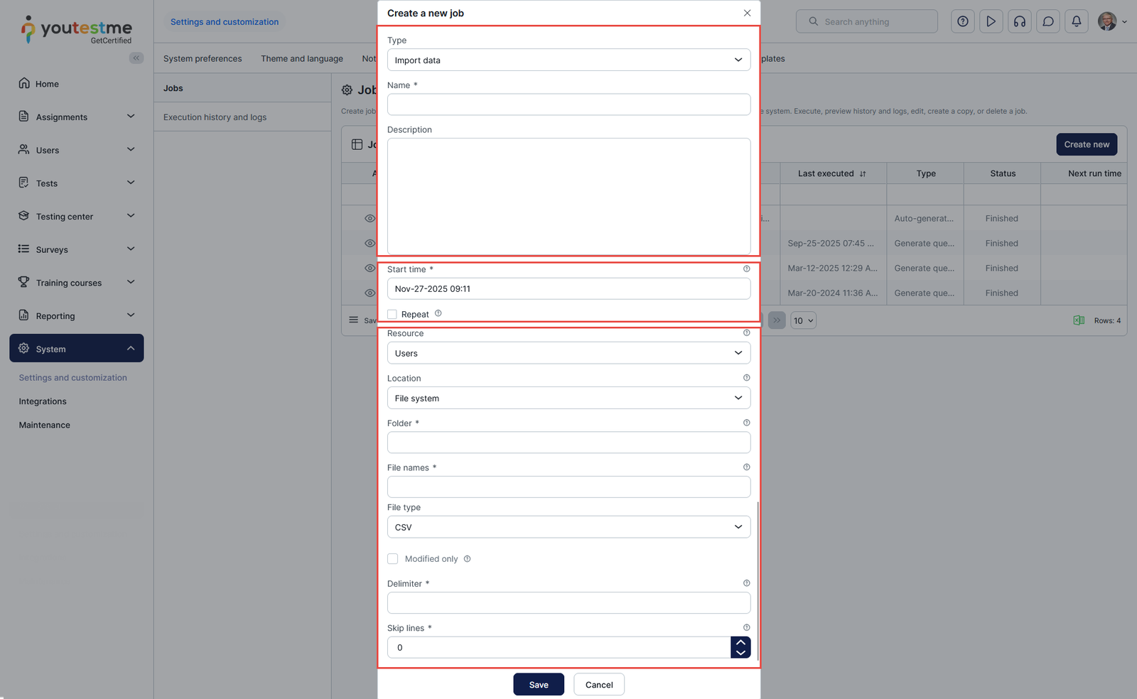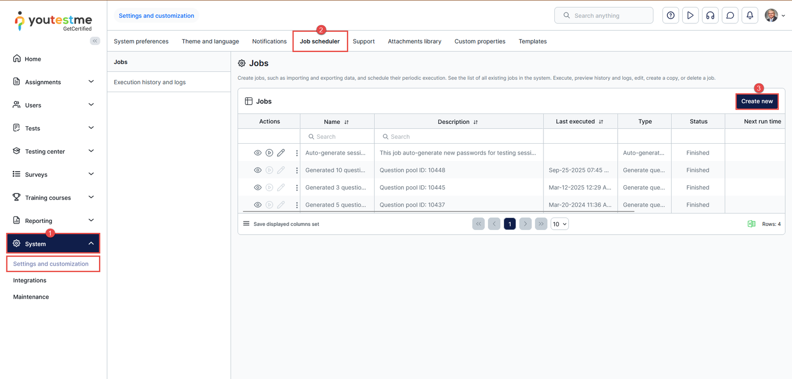 Note: On the Jobs scheduler tab, you can create jobs that will be executed at the scheduled time as many times as you require. The job allows you to automatically import the data from an external system into the YouTestMe GetCertified and export data from the YouTestMe GetCertified to an external system.