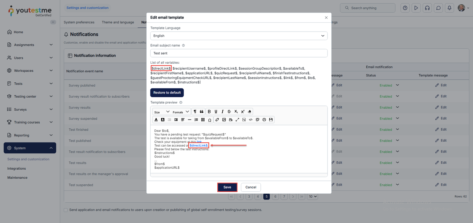 Include the $directLink$ variable in the email notification template, make the necessary adjustments, and then click the Save button to save the modifications.