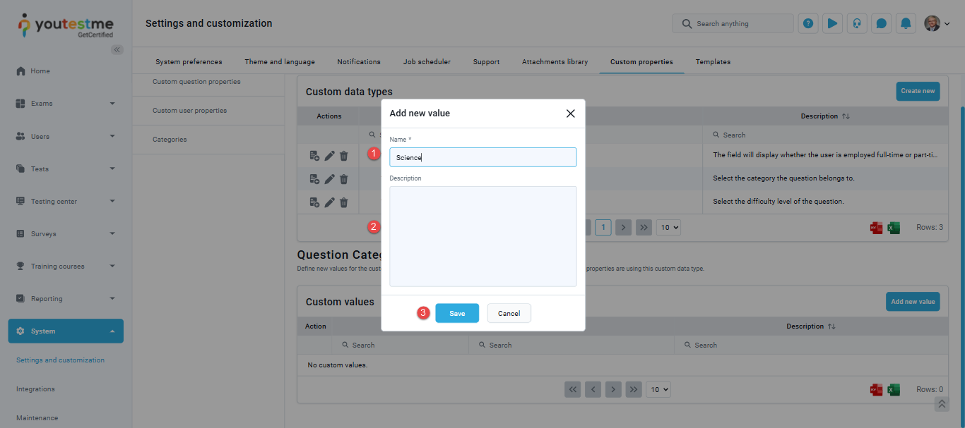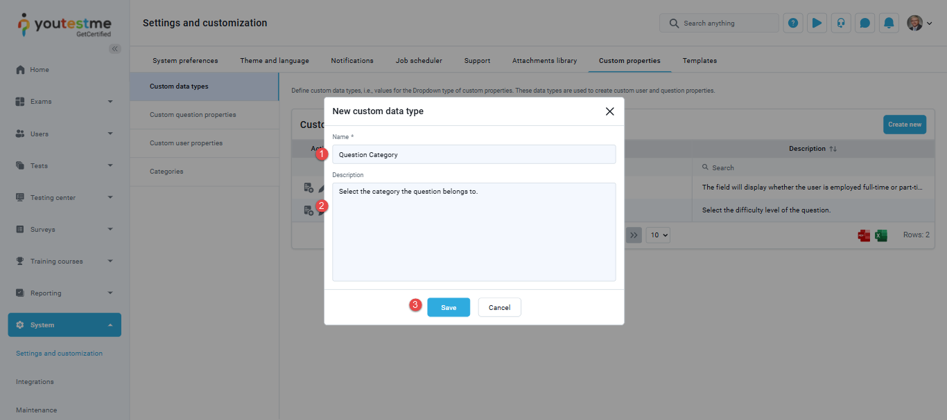 When manually creating a question in the Question Pool, the Custom Question Properties fields are displayed under the Additional Settings section. This feature allows users to assign the desired properties to the question efficiently.
