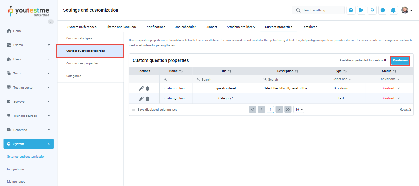 The entered question property will appear as a new column in the questions table. This column will include filters, enabling users to sort and filter questions based on the custom properties created.