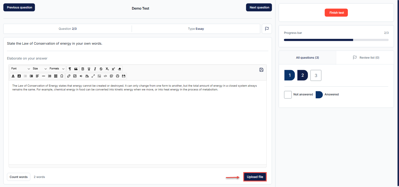 By default, the Upload File option is enabled for all essay questions. You can disable this feature by following the steps below: