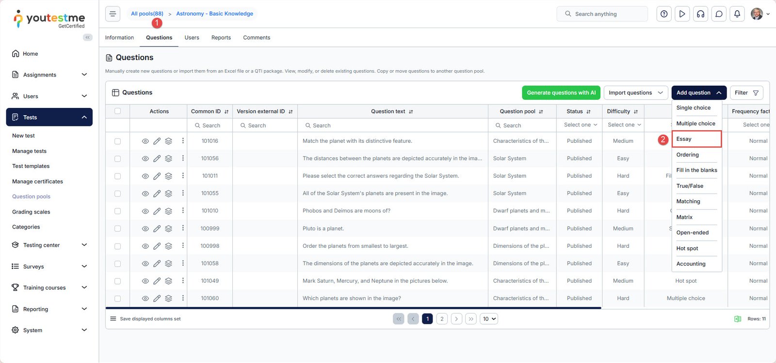 - In the main menu, navigate to Tests and select the Question Pools module.