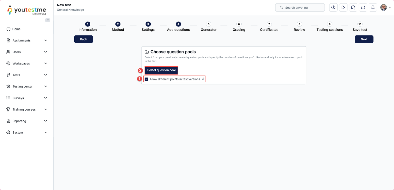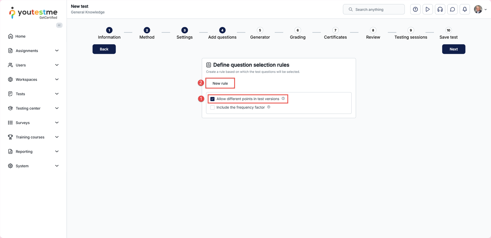 - Move to the fourth step of the test creation wizard and enable the Allow Different Points in Test Versions option.