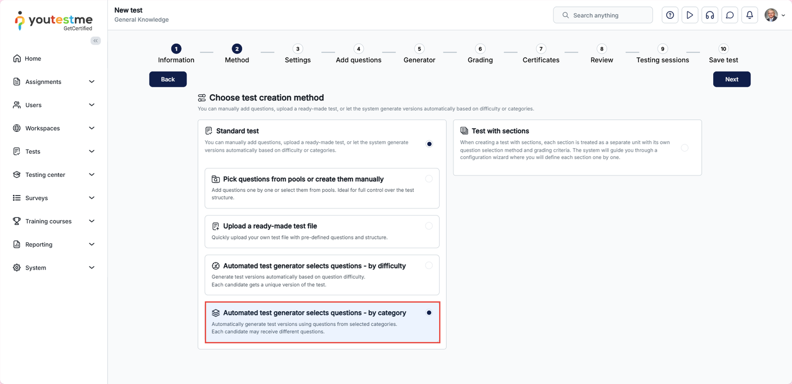 At the second step of the Test Creation Wizard, choose the Automated test generator selects questions – by category option.