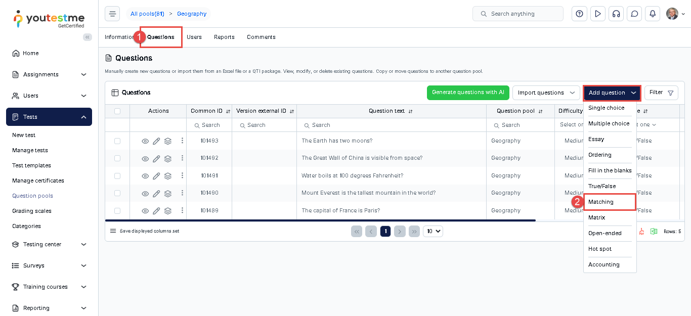 A matching question requires candidates to pair items from two separate lists: a left list and a right list. The candidate’s task is to match each item from the right list with its corresponding item on the left list.