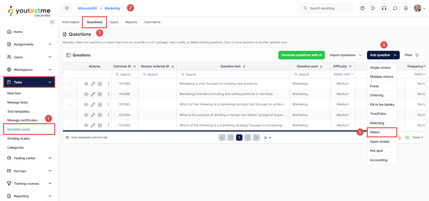 - From the list of pools, select the desired question pool where you want to add the matrix question. Alternatively, you can create a new question pool. For more details on how to create and use Question Pools, visit this article.