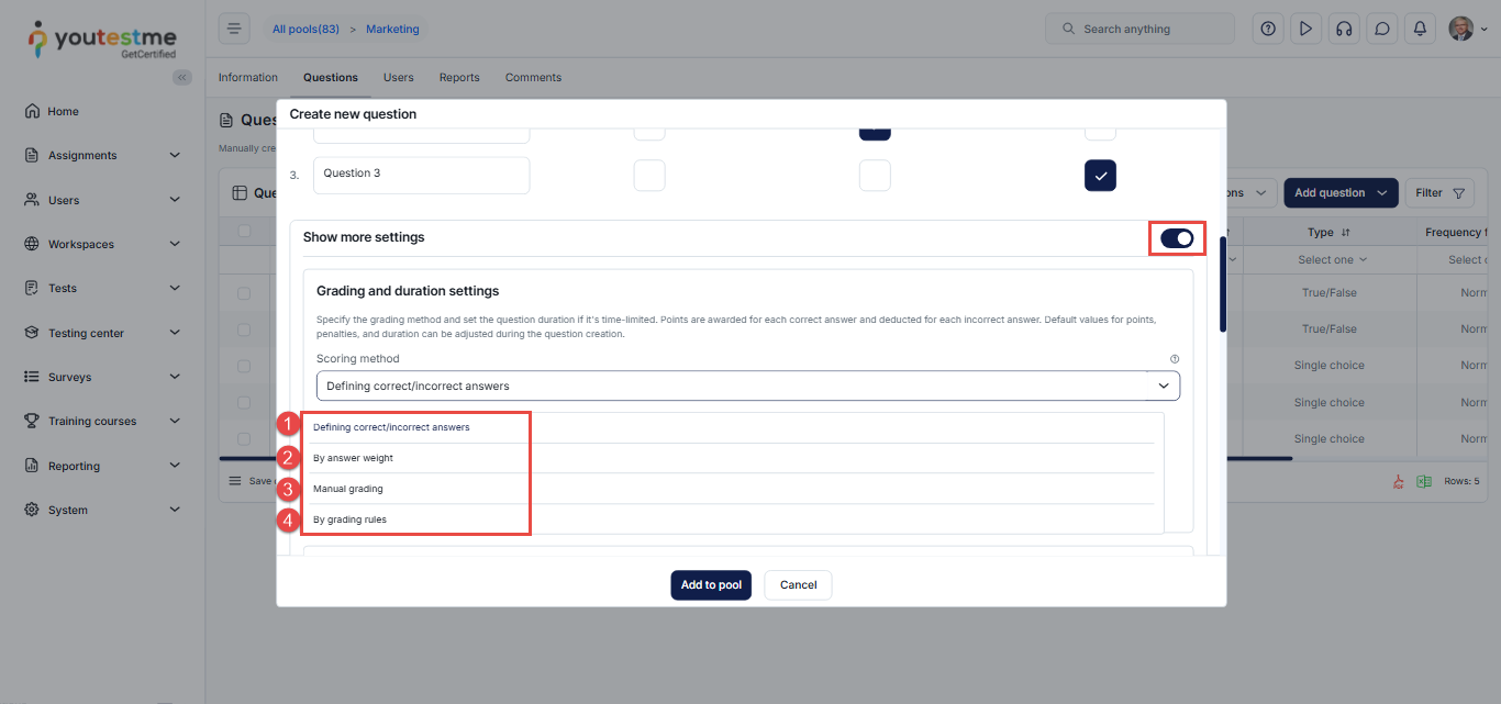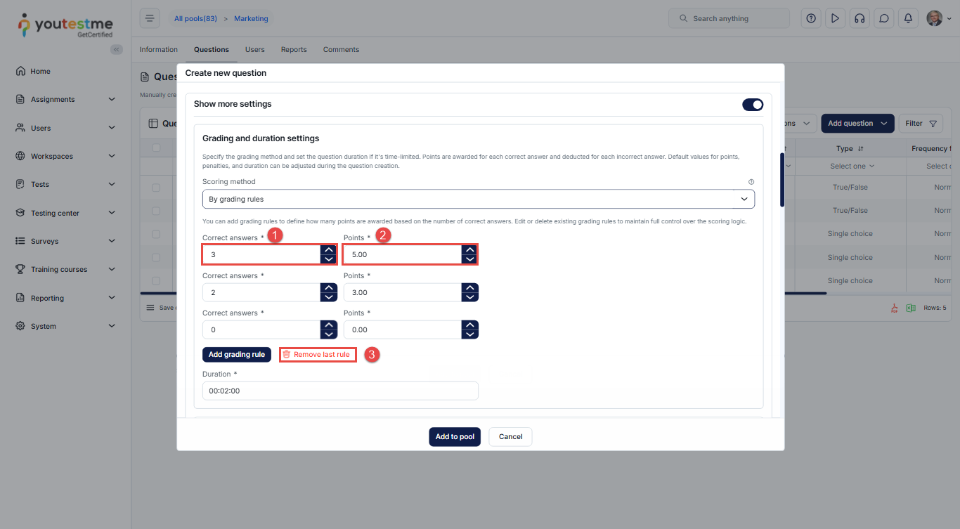 - By grading rules – Define specific rules to assign points based on the number of correct answers a candidate selects.