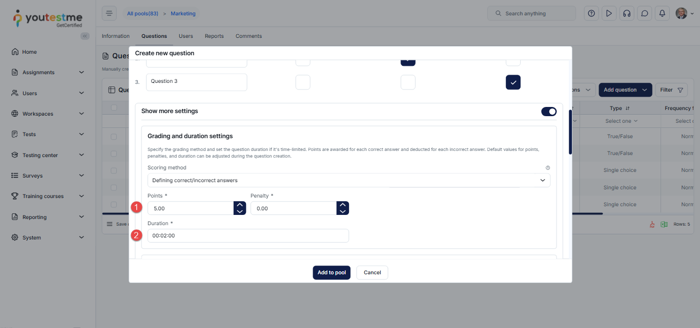 - Specify the number of points awarded for a correct answer and the penalty points for an incorrect answer.