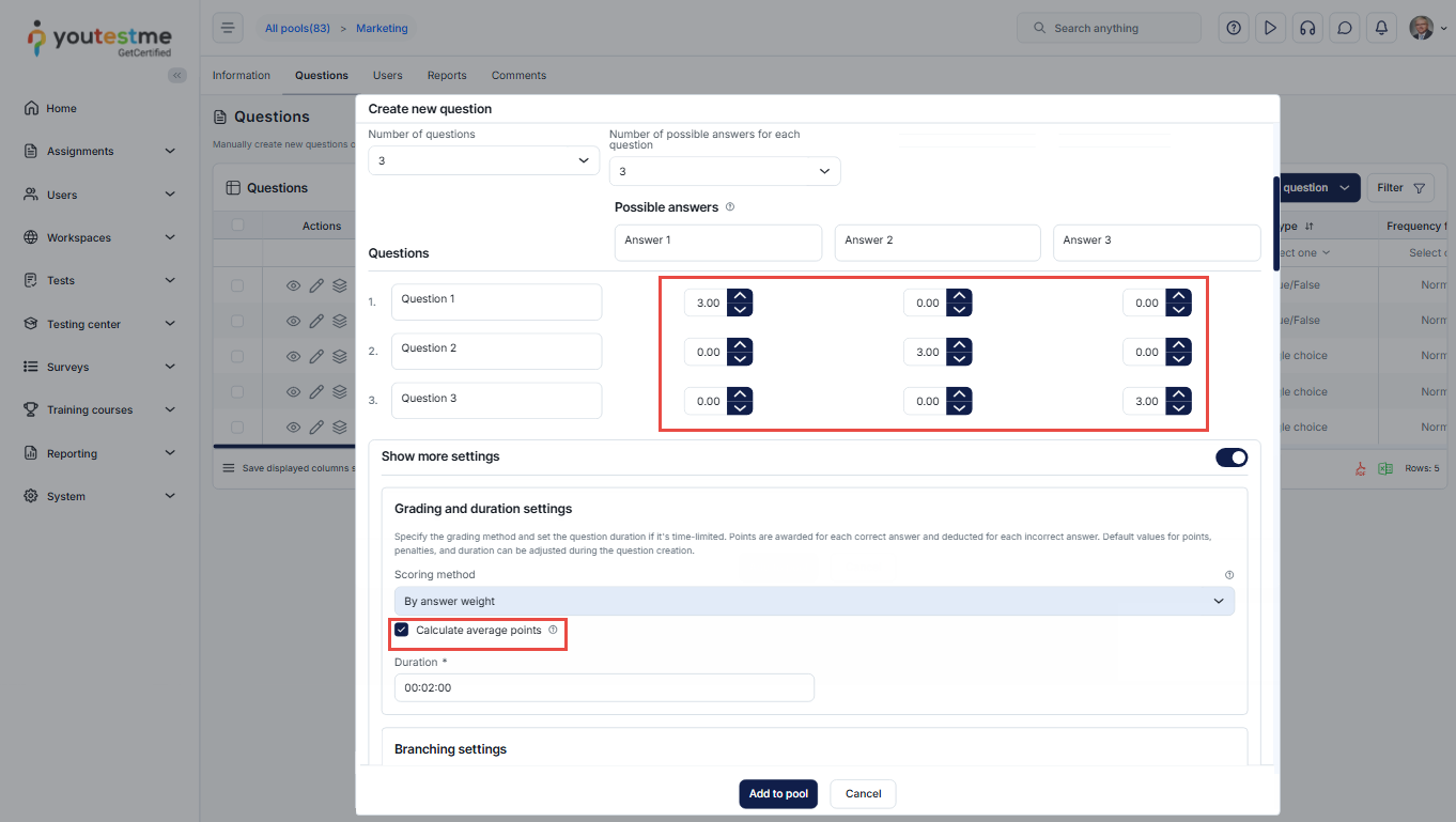 By enabling the By answer weight scoring method, you can specify the points for each answer.