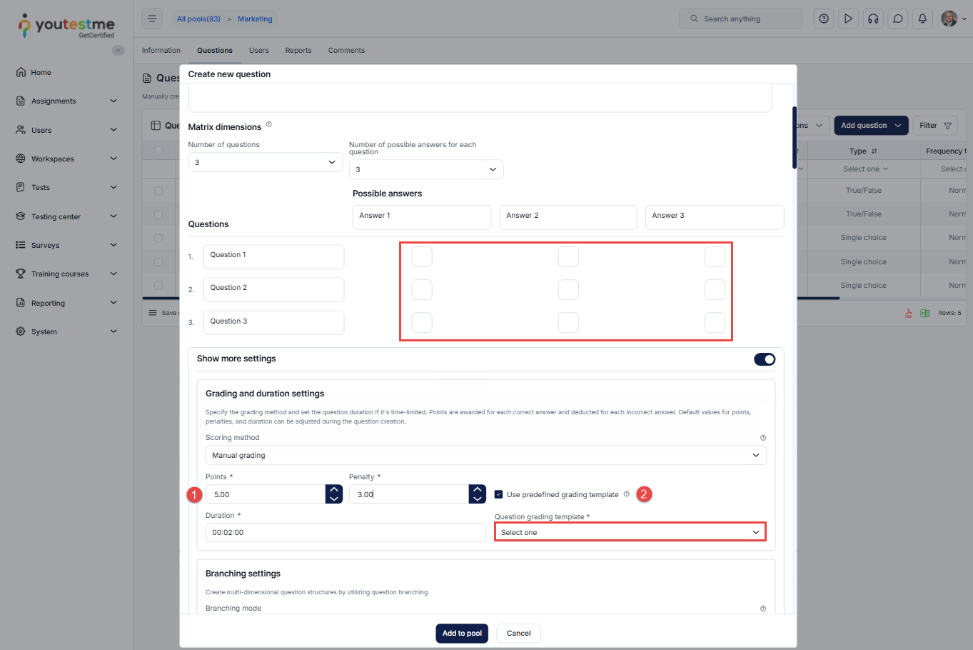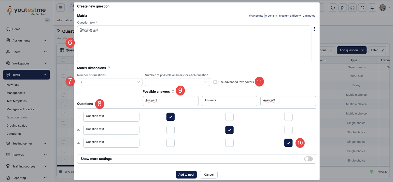 After selecting the correct answers, you can configure additional settings for the matrix question.