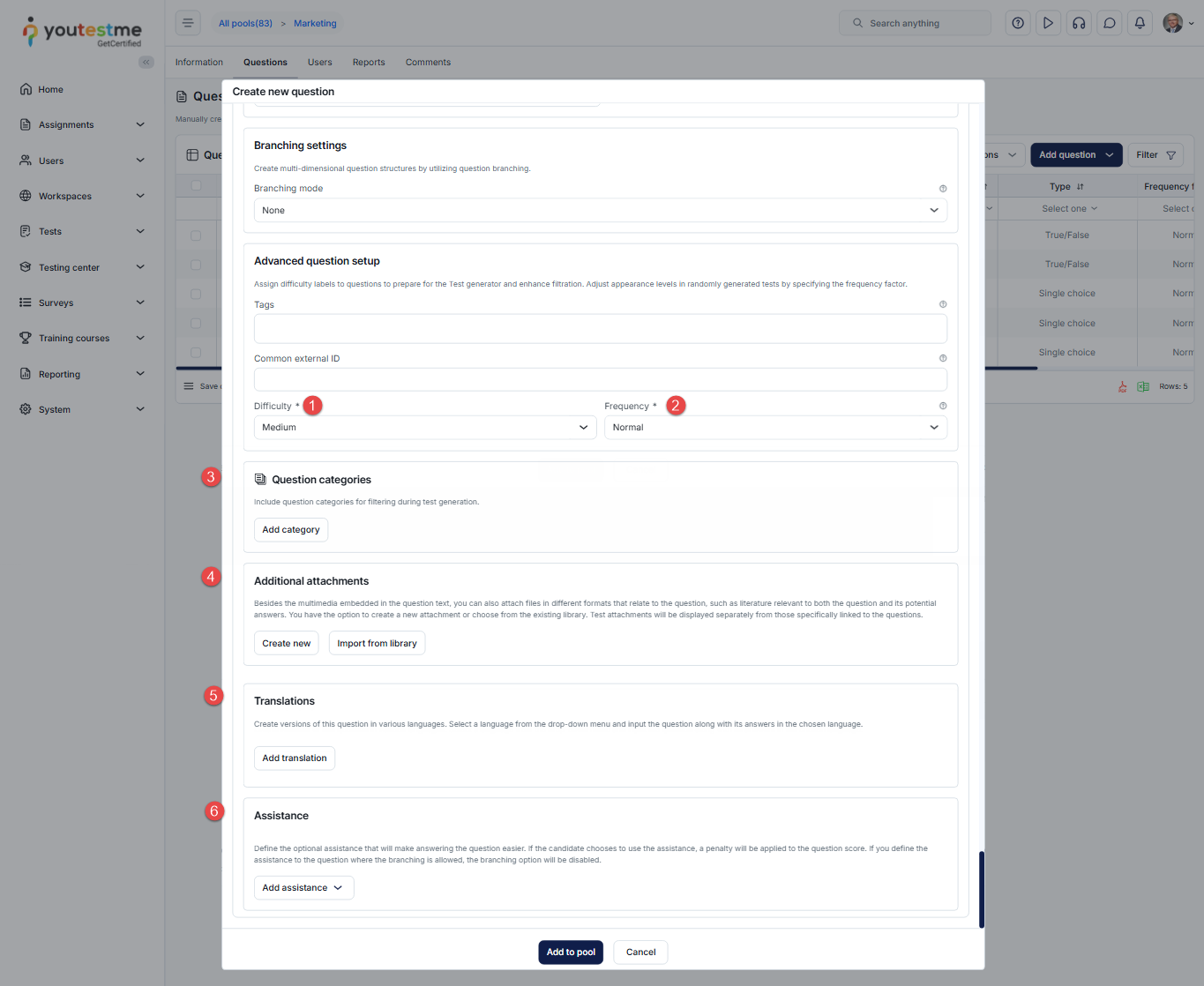 - Set question frequency – Use the Frequency dropdown menu to define how often the question appears in tests: Never, Rarely, Normal, Often, or Always.