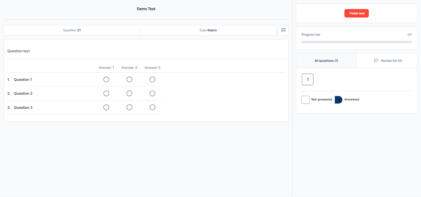 This question type presents multiple related sub-questions arranged in rows, with a shared set of possible answers displayed in columns. Candidates must select one answer for each sub-question, making this format suitable for evaluating multiple statements against the same criteria in a structured and consistent way.