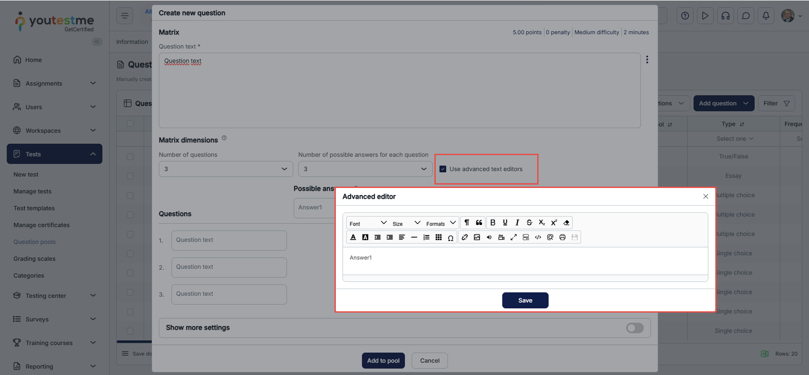 - If you check the Use advanced text editors option, click on the field where you want to use the advanced editor. A pop-up window will appear, allowing you to add or format the question or answer text using advanced editing tools.
