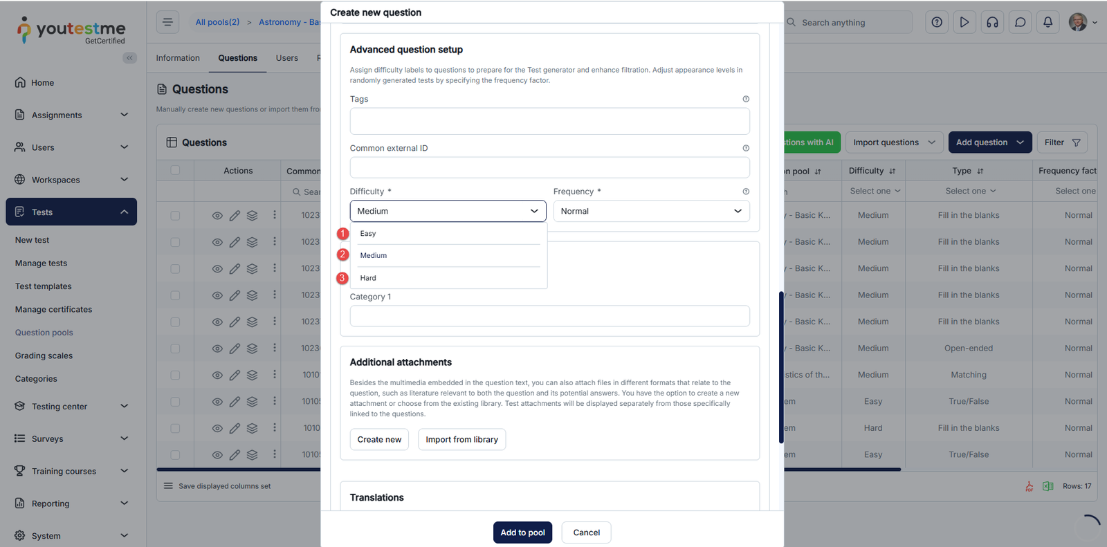 For advanced question setup, assign difficulty labels to questions to prepare for the Test generator and enhance filtration. Adjust appearance levels in randomly generated tests by specifying the frequency factor.