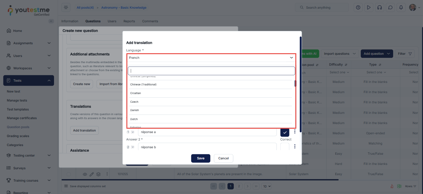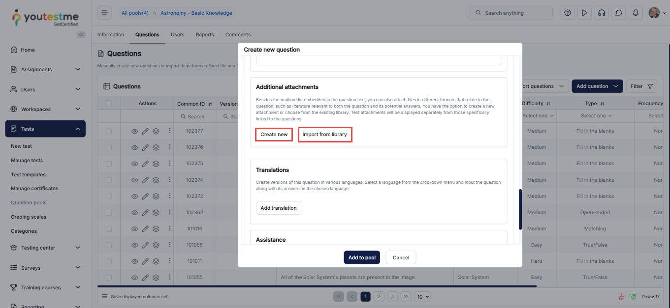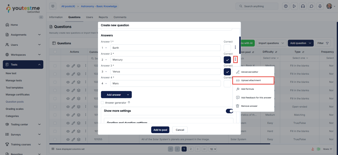 Note: The same applies when creating a question from the Question pool tab and the Test Creation Wizard. Please note that only Single-choice and Multiple-choice questions can have answer attachments.