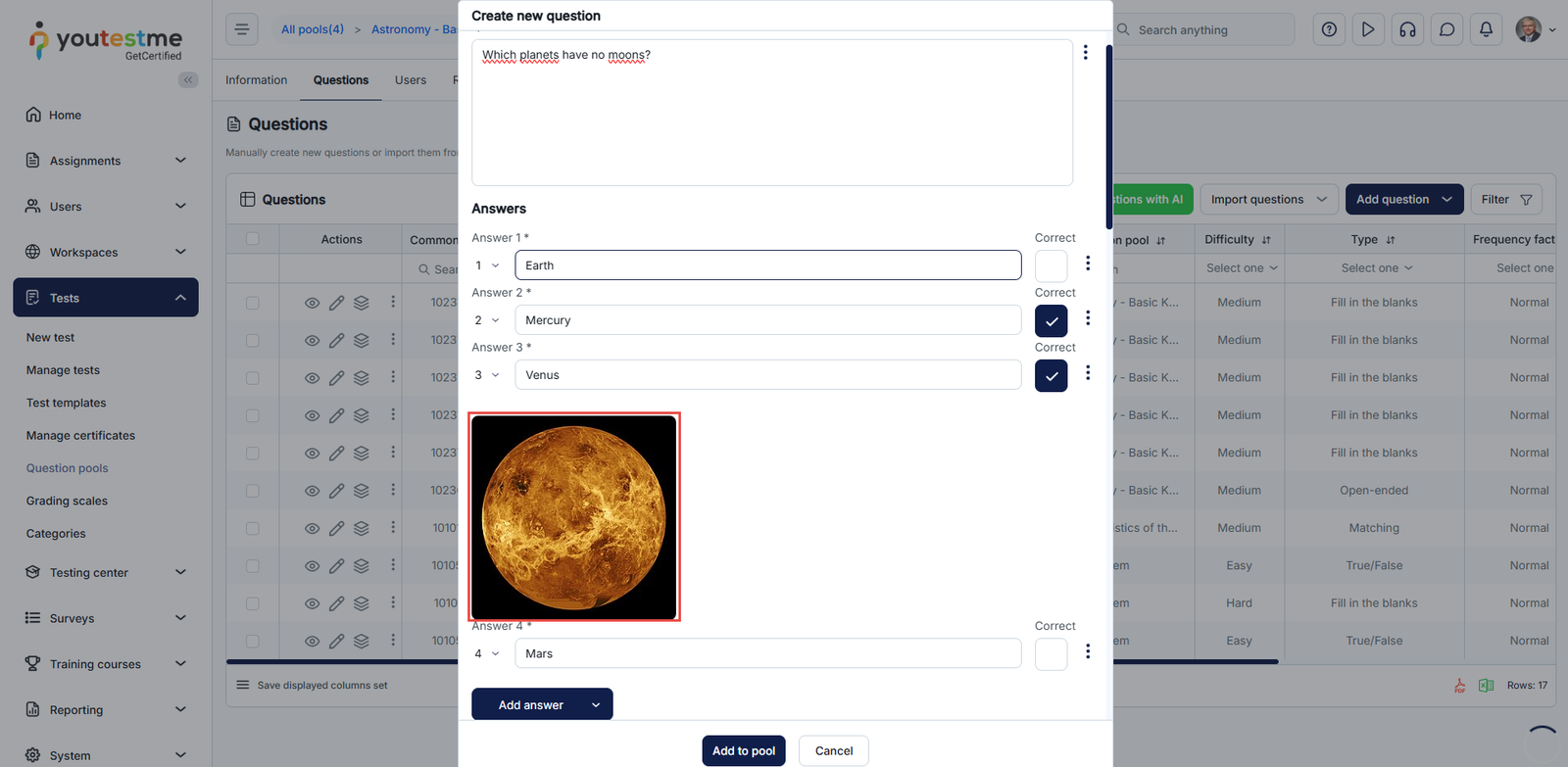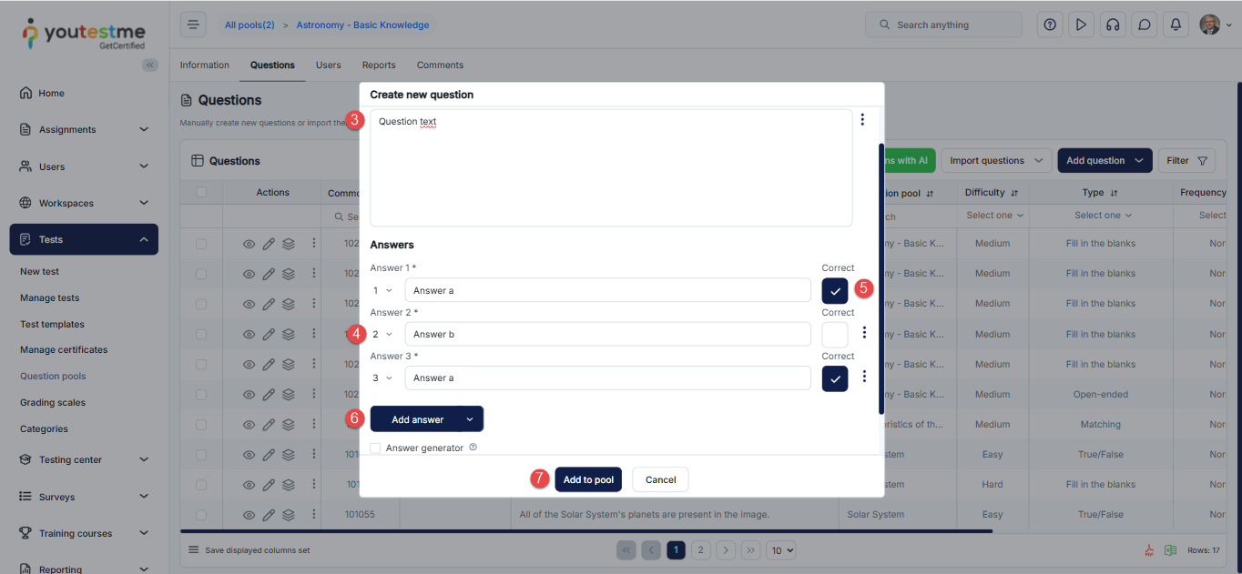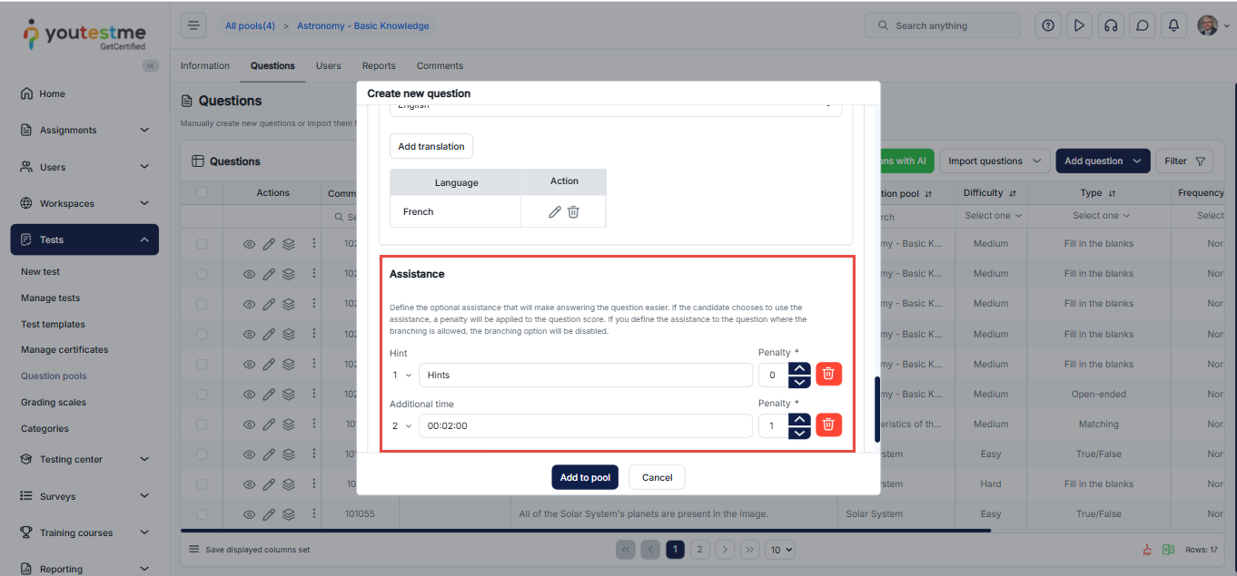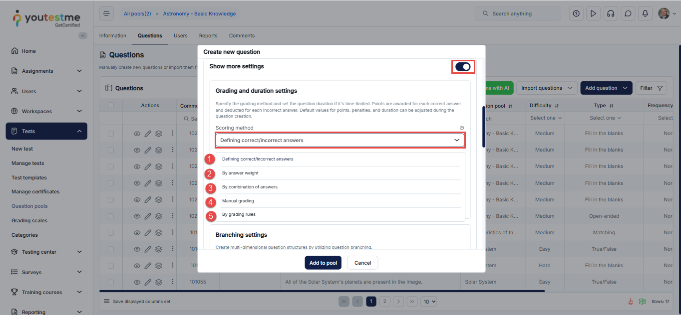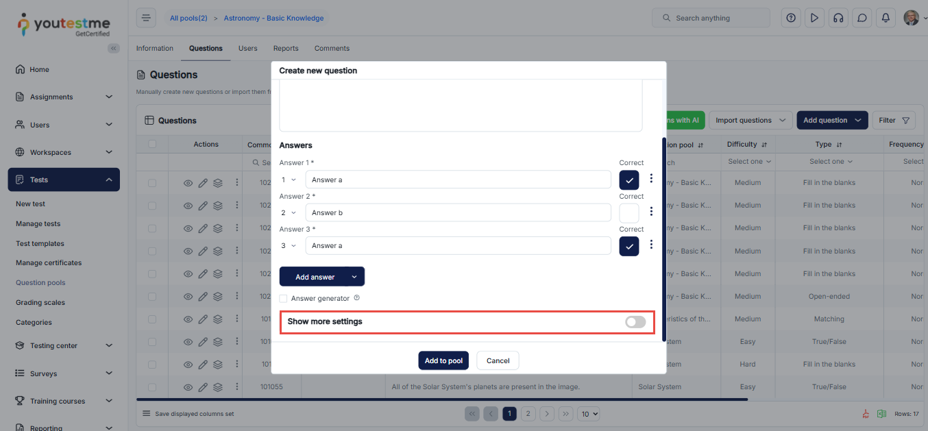 - Click on the Add to pool button to include the question in the pool’s list of questions.