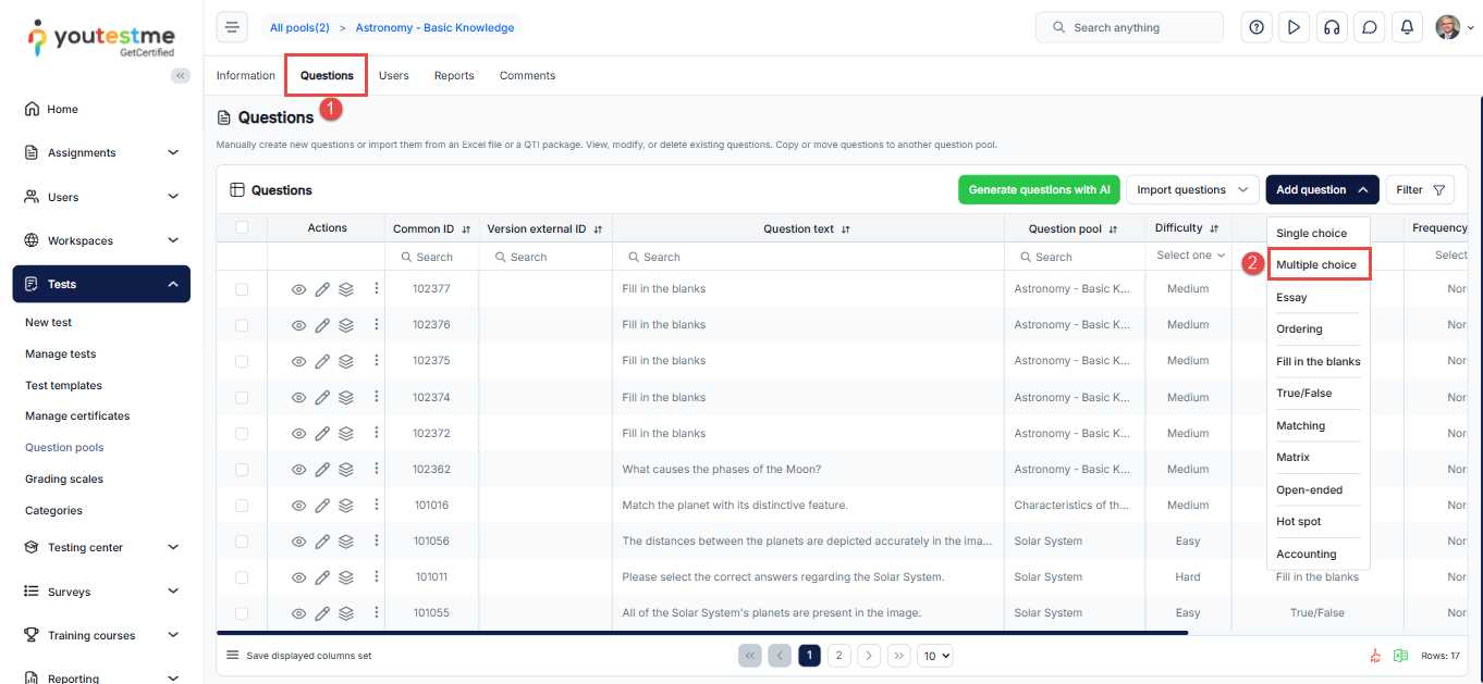 - In the main menu, navigate to Tests and select the Question Pools module.