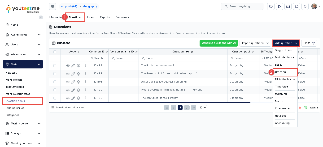 - Access the desired question pool to which you would like to add the ordering question and navigate to the Questions tab.