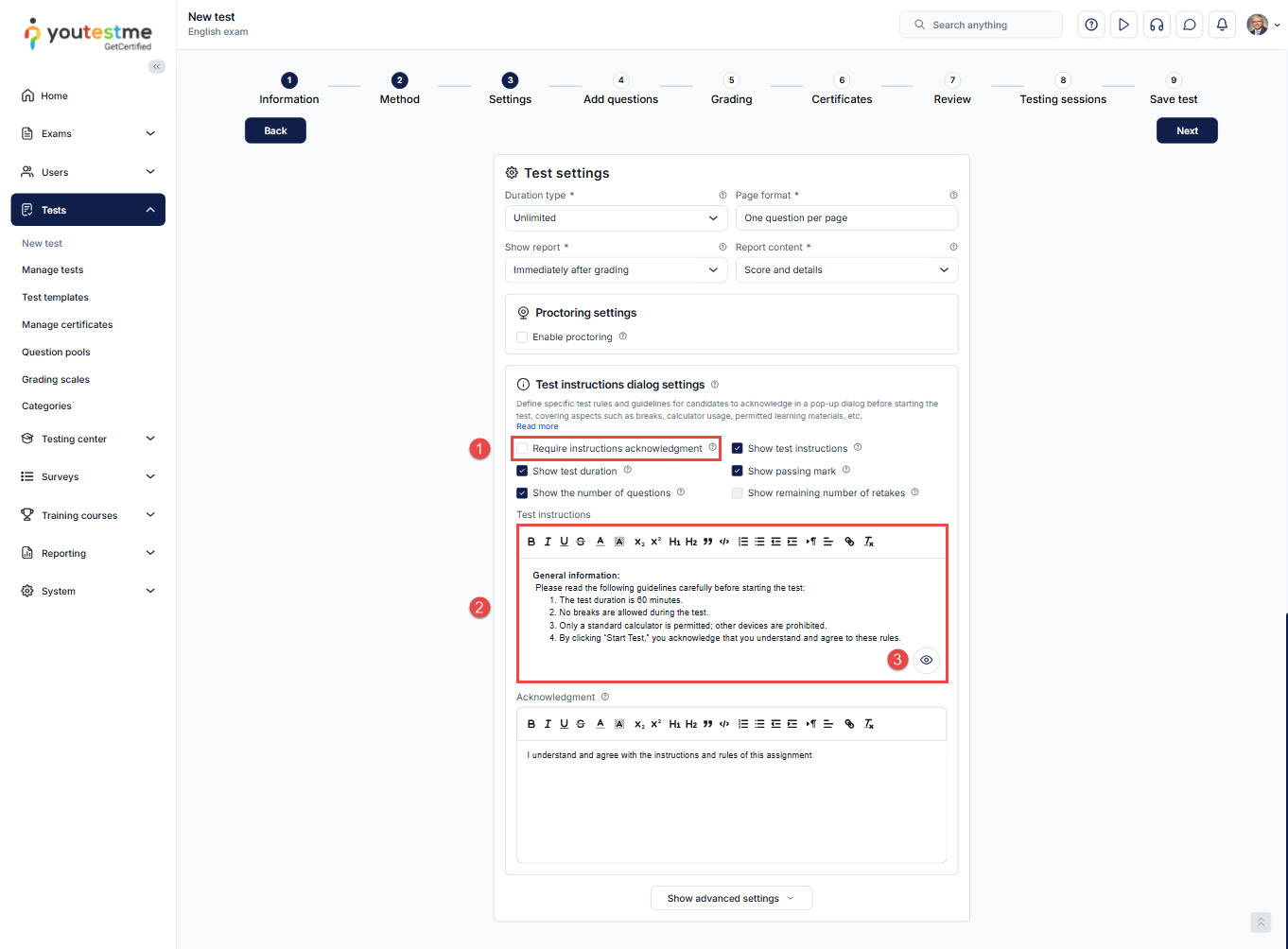 - Require Instructions Acknowledgment: Enabling this option requires test-takers to acknowledge the test instructions before starting the test.