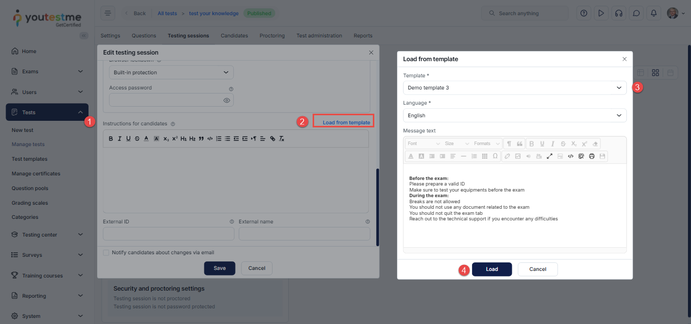 Session instructions allow you to provide additional guidelines or rules that candidates must follow during a testing session. These instructions can be added directly for each session or applied using a predefined template.