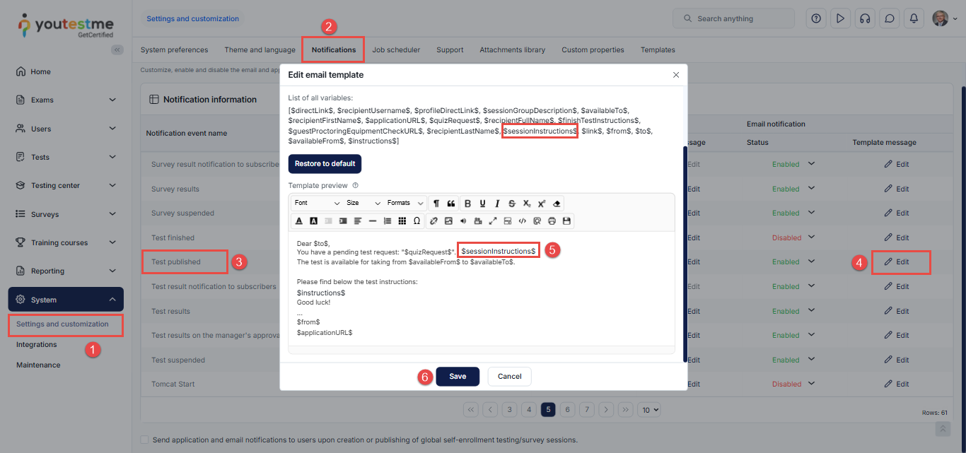 The YouTestMe system allows test creators to include test instructions in the email notification automatically sent to candidates upon enrollment. To include these instructions, follow the steps below: