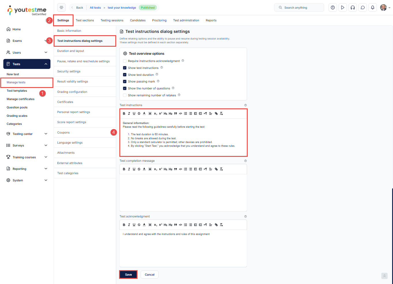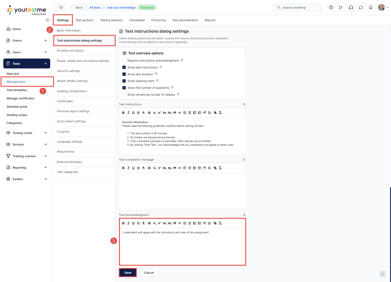 - Select Test Instructions Dialog Settings, edit the instructions text in the Test Acknowledgement, and click the Save button to apply and save your changes.