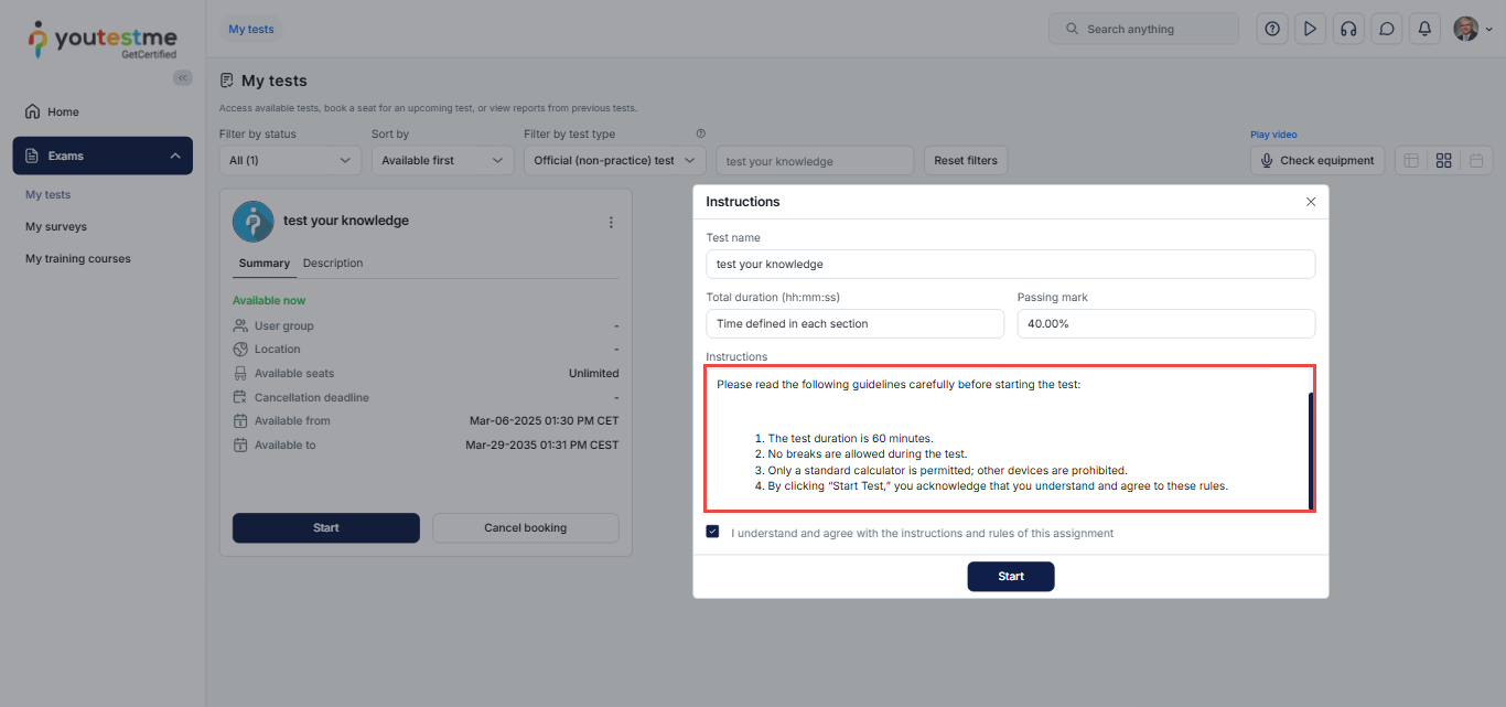 Test instructions define specific rules and guidelines that candidates must acknowledge in a pop-up dialog before starting the test, such as rules about breaks, calculator usage, or permitted materials. These instructions can be added either during test creation or later, for a Created Test