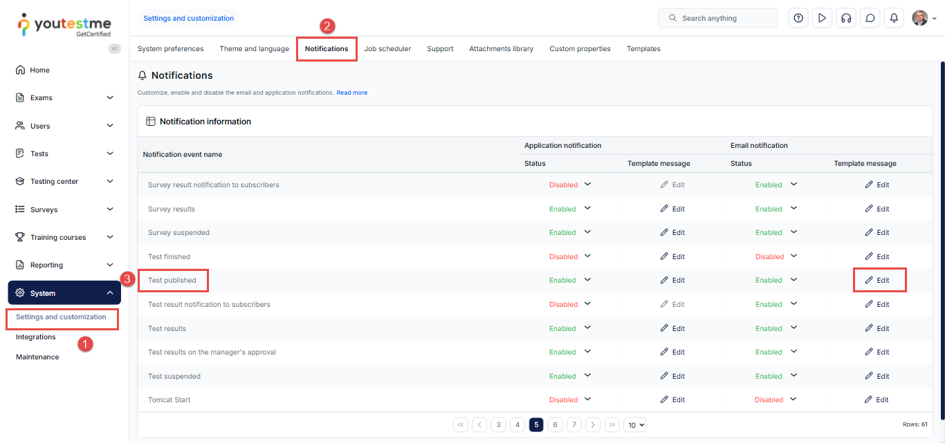 - Locate the Test Published notification event, and click the Edit button in the Template Message column under Email Notification. A pop-up window will appear, allowing you to preview and edit the email template.