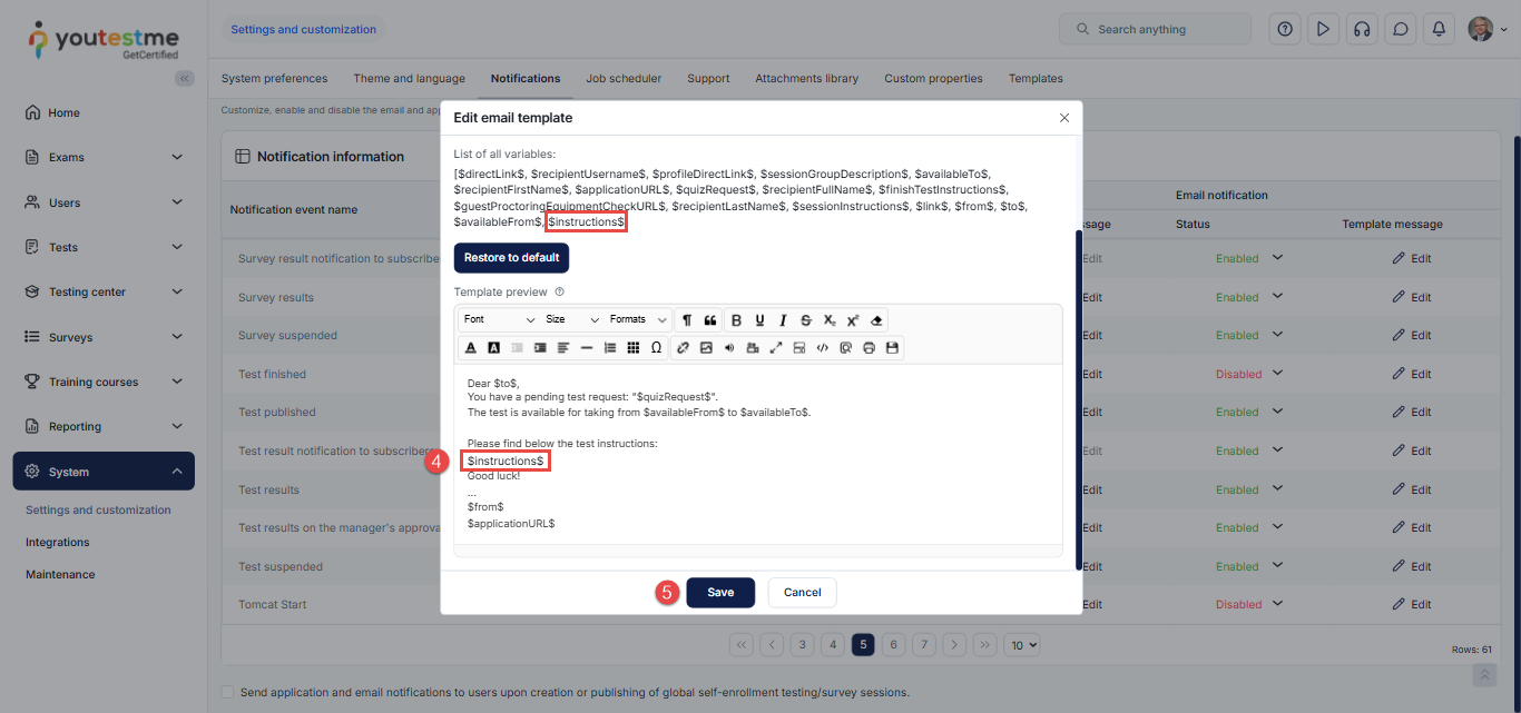 - Add the $instructions$ variable to the email template to ensure the test instructions are included in the notification sent to candidates.