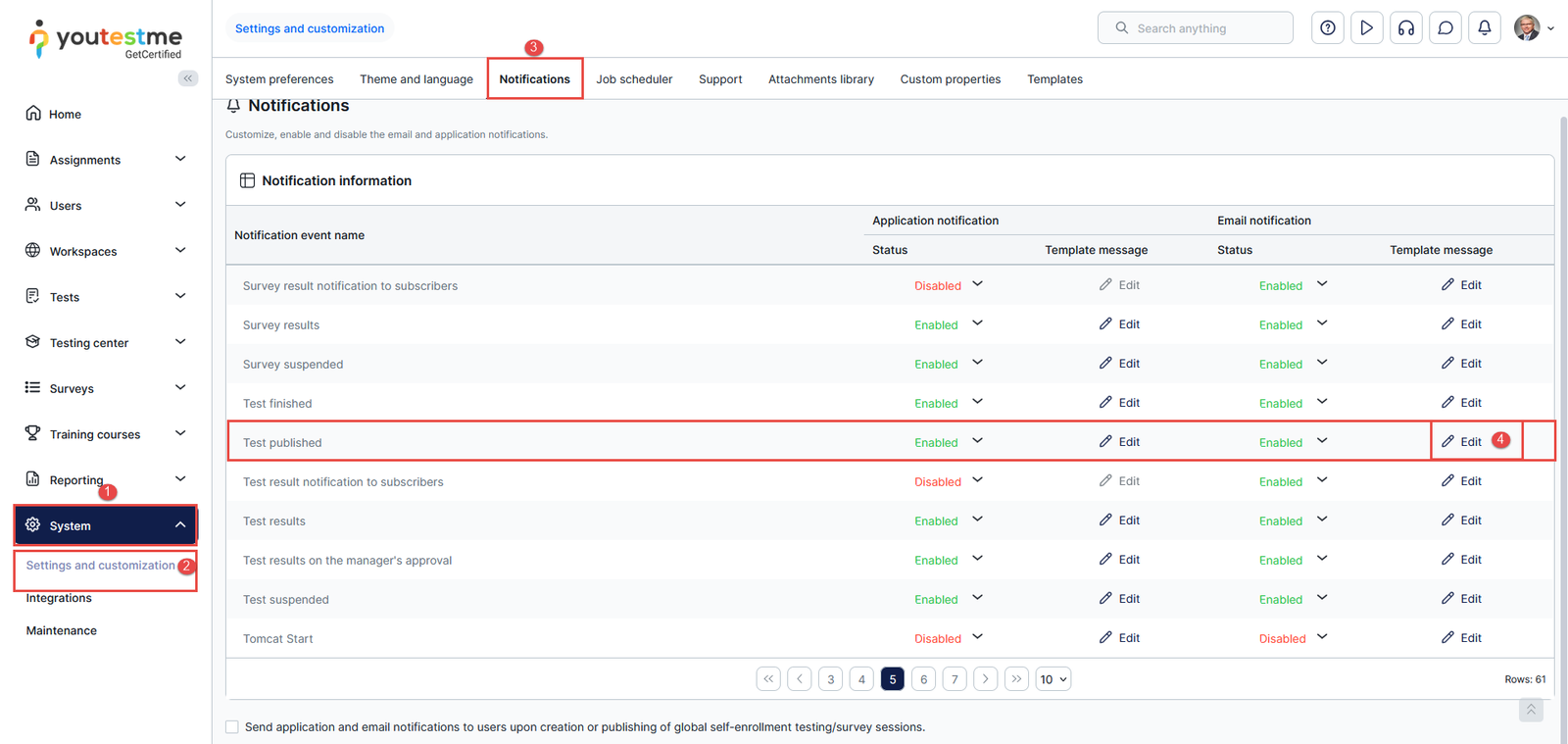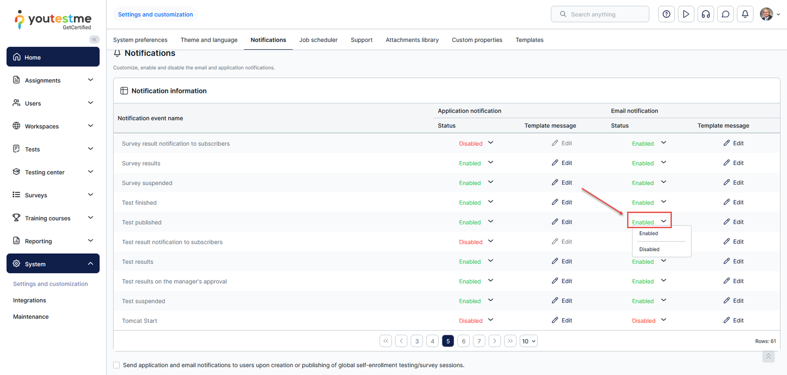 - Find the desired notification and click on the Edit option in the e-mail notification column.