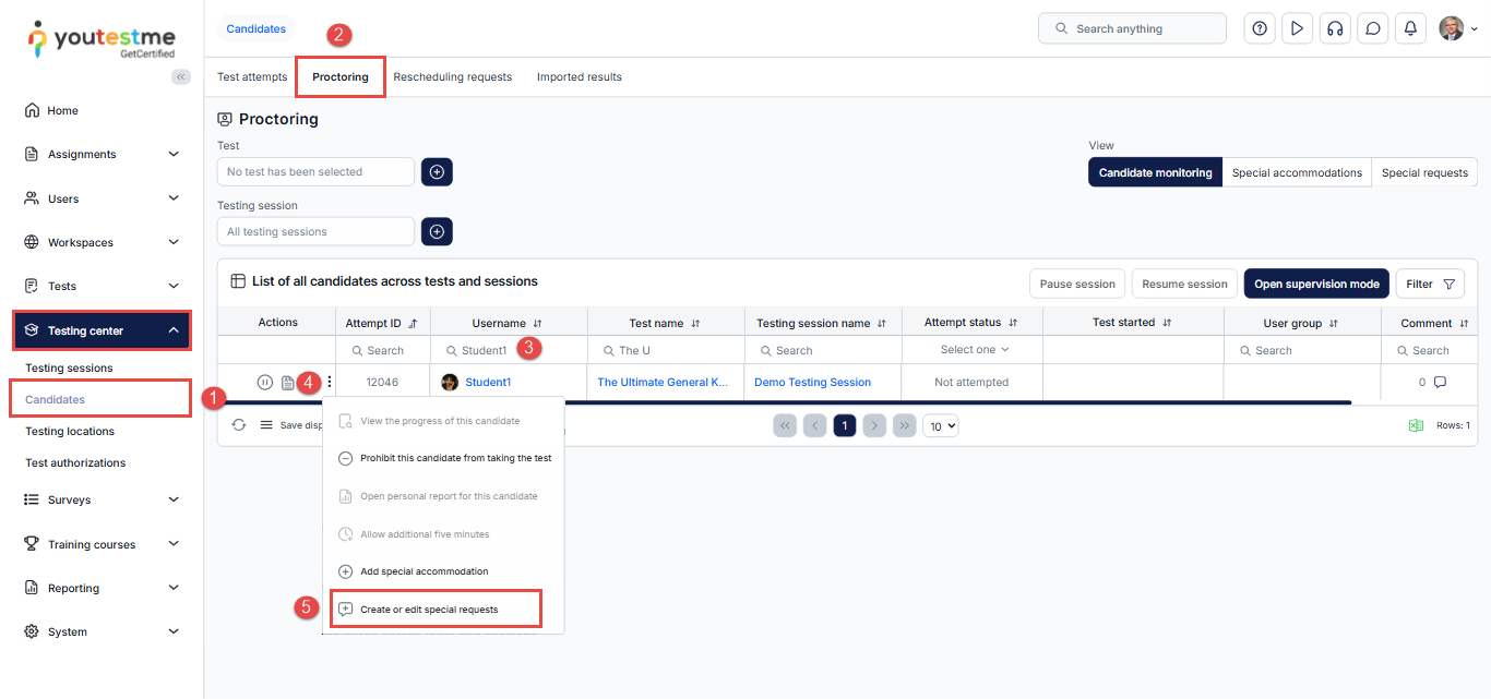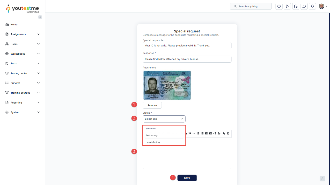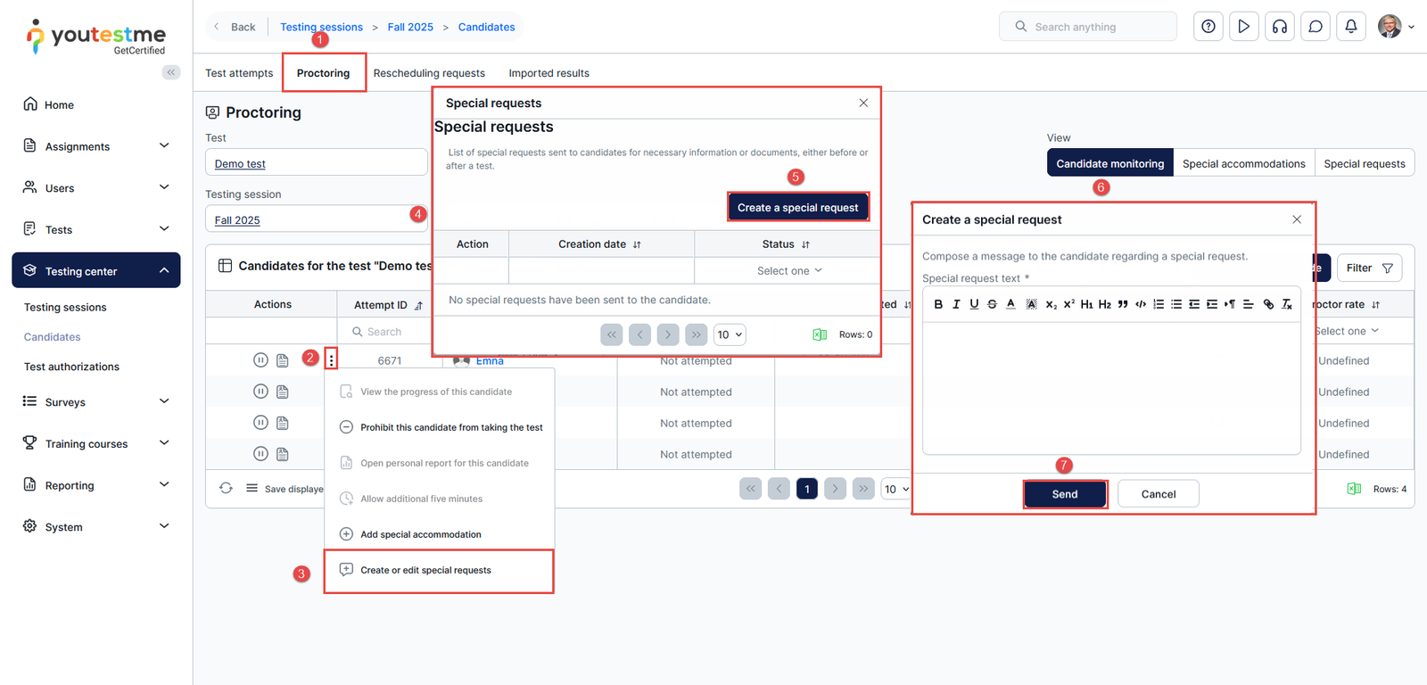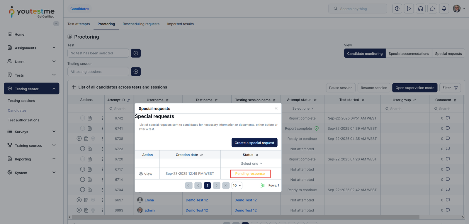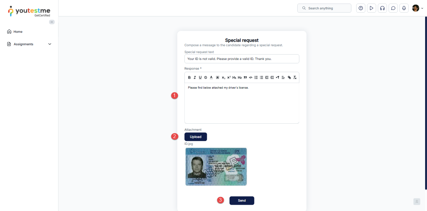 The Special request option enables users to request specific documents or information from candidates at any point, both before and after a test. This article explains how instructors, proctors, and support can send special requests to candidates, such as re-uploading their ID verification photos within a defined period.