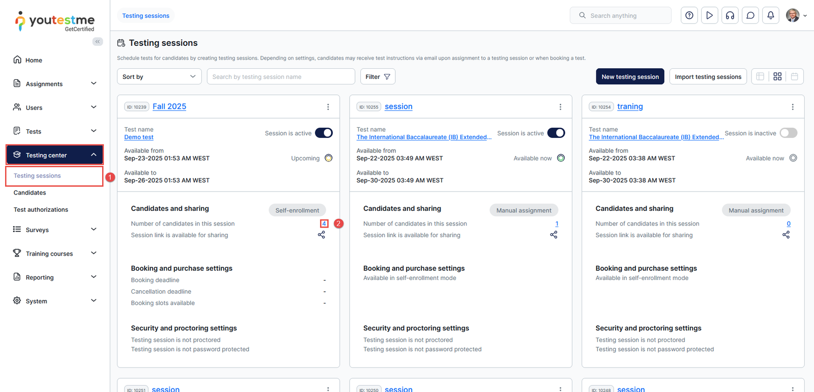 - Navigate to Testing sessions from the Testing center page.