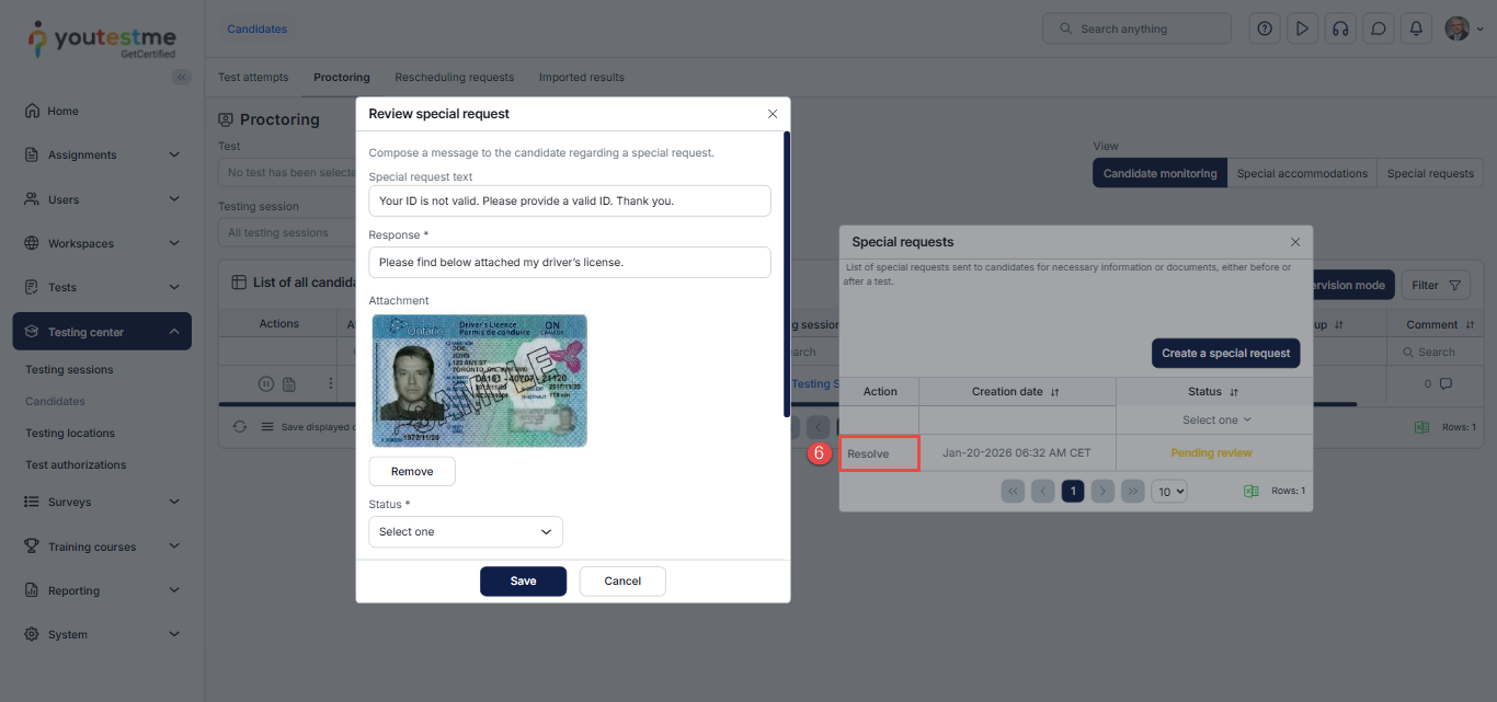 For example, before a test, candidates must submit their IDs. However, immediate verification by the proctor is impossible, and the process occurs afterward. If the proctor considers the provided ID invalid, they can use the special request option to request an updated, valid ID from the candidate. This prevents the test attempt from being canceled due to an invalid ID.